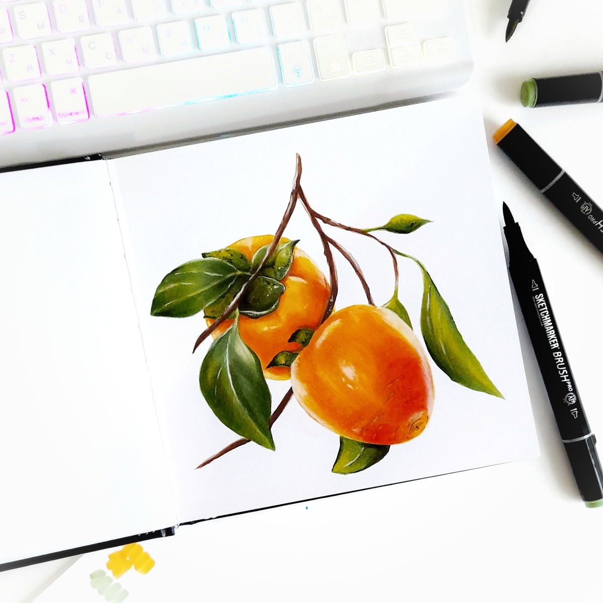 Так как бумага здесь очень плотная, она забирает больше чернил маркера. Чтобы плоды получились реалистичными, насыщенными и яркими, я накладывала оттенки не менее чем в три слоя. И да, листы действительно не пропускают чернила на обратную сторону, можно спокойно на ней рисовать, что я и сделала.
