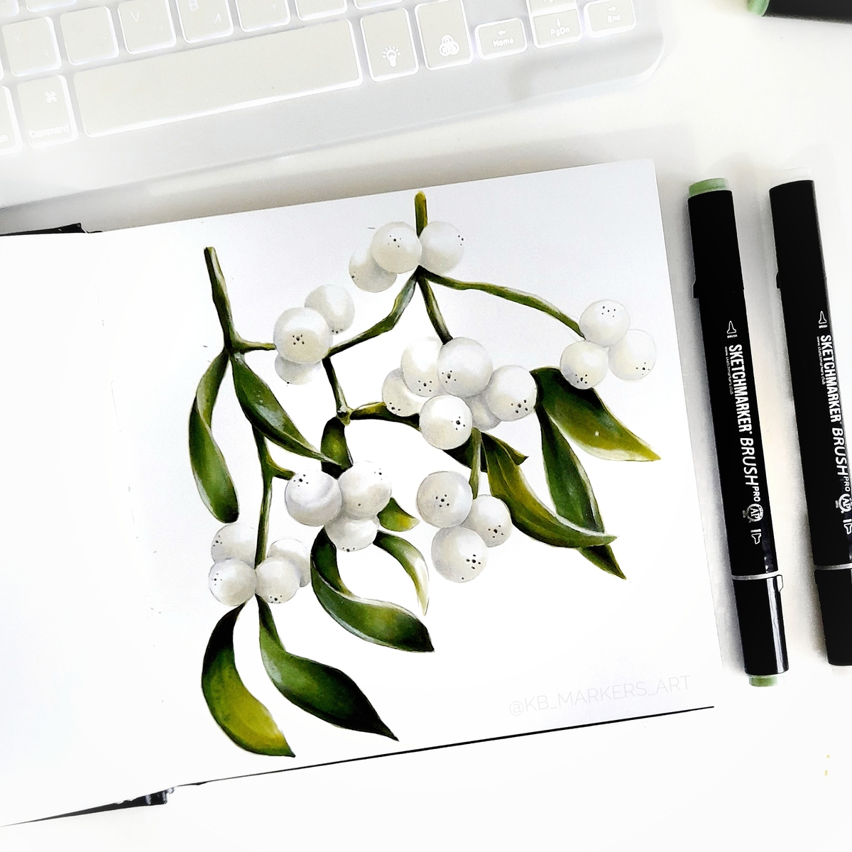 А как же на такой плотной бумаге будут выглядеть белые предметы и как поведут себя серые оттенки? Я использовала довольно бледные серые маркеры для ягод омелы, пришлось сделать много наслоений, но результат порадовал.
