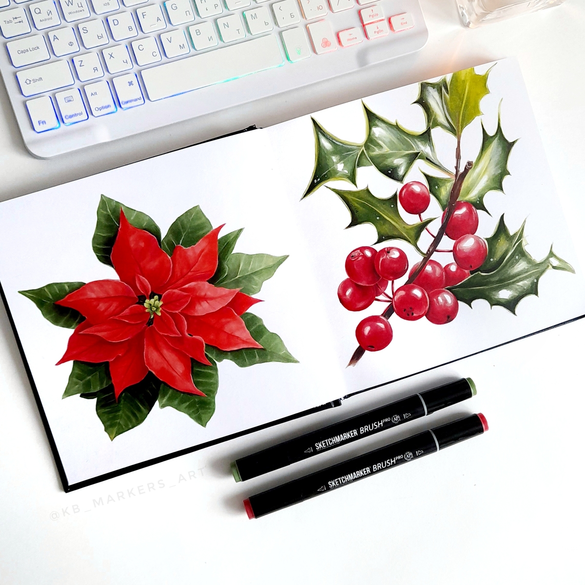 К Рождеству я рисовала тематический ботанический разворот: вновь спасибо двухсторонней бумаге за такую возможность. И повторю: из-за её высокой плотности расход маркеров весомый, поэтому стоит запастись дополнительными чернилами.