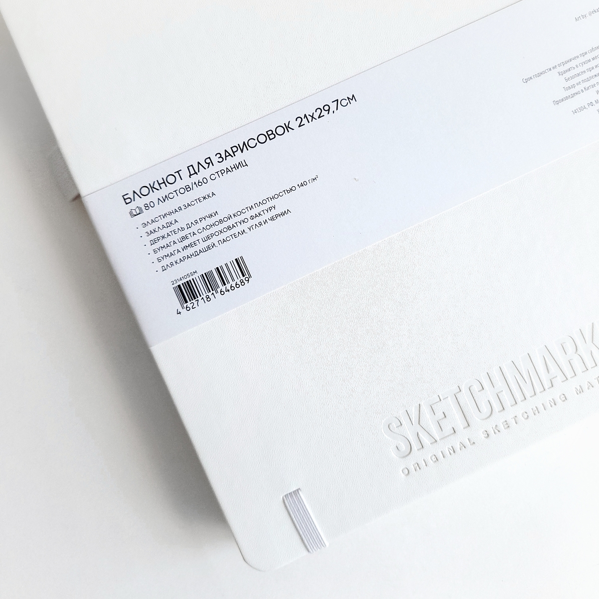 На обратной стороне ещё некоторые важные сведения: бумага в этом скетчбуке имеет шероховатую фактуру, подходит для карандашей, пастели, угля и чернил.
