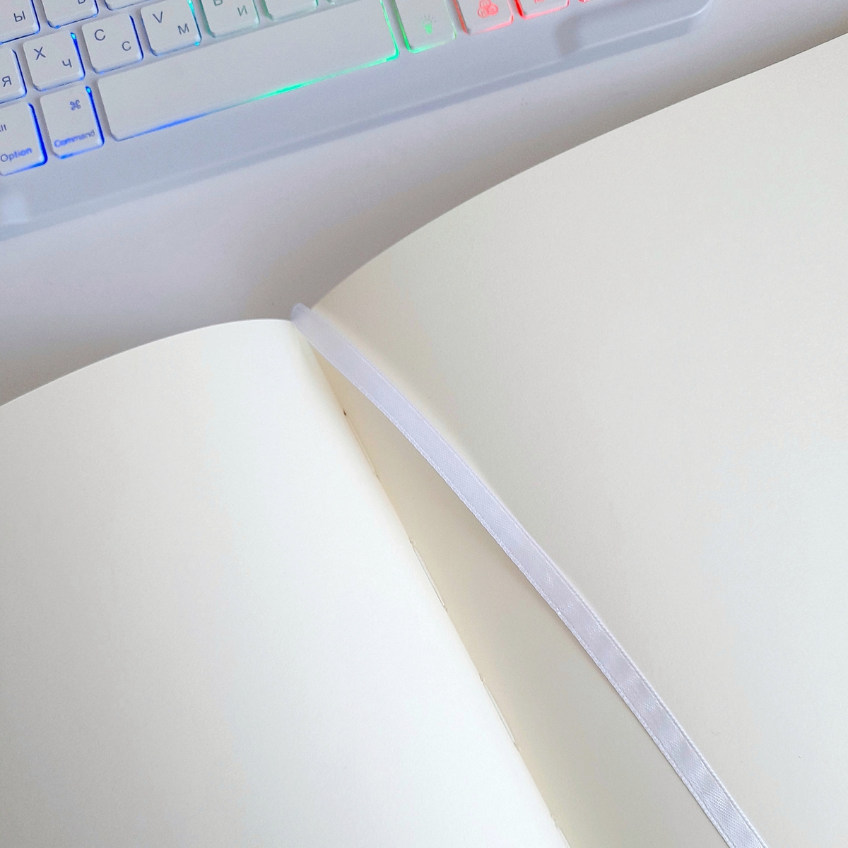 Есть эластичная застёжка, атласная белая закладка, держатель для карандаша/ручки. Бумага внутри кремового оттенка (цвета слоновой кости, как пишет производитель).