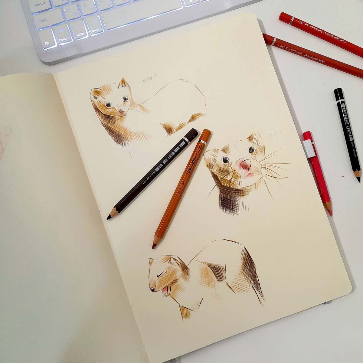 Настало время скетчинга. Для разных зарисовок я использовала цветные карандаши, акварель, линеры и спиртовые маркеры.
