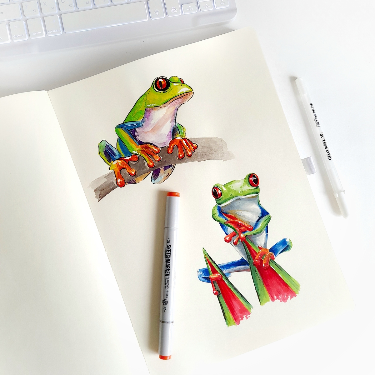 Верхнюю лягушку, сидящую на ветке, рисовала акварелью с добавлением цветных линеров. На мой взгляд, блокнот слабо подходит для такого: бумага начинает идти волнами даже от небольшого количества воды и не раскрывает всех свойств акварели. Думаю, использование последней возможно только в качестве лёгкой подложки для других материалов — например тех же линеров.