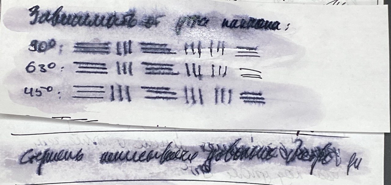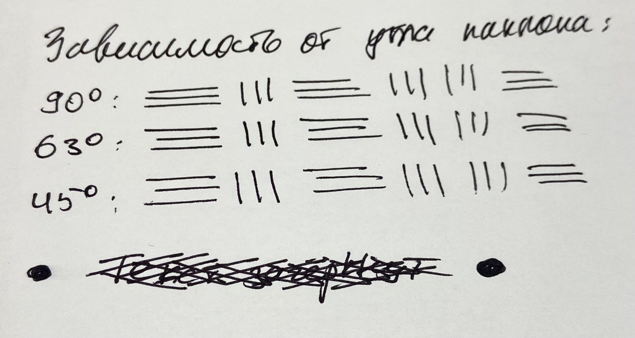 Всячески наклонял ручку: толщина линии почти не меняется, но лучше всего в плане сочности/яркости/лёгкости письма дела обстоят под углом примерно 63 градуса. При 90 градусах пишет хуже. При 45-ти комфортно, но появляется механический шум (спасибо размеру шарика). При малых углах начинаются стандартные пропуски и царапания.