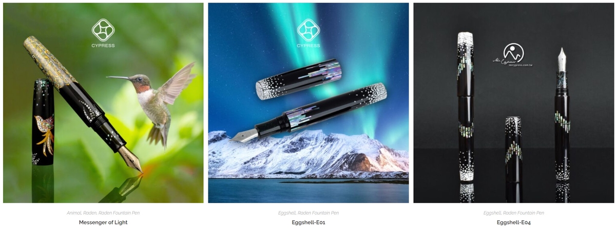 Мне больше всего нравятся ручки Cypress из эбонита и карбона. Что касается отделки, то среди фаворитов раден (когда делается инкрустация перламутром), декор яичной скорлупой и японский лак Urushi (漆). Невероятно красиво и… невероятно дорого! :)