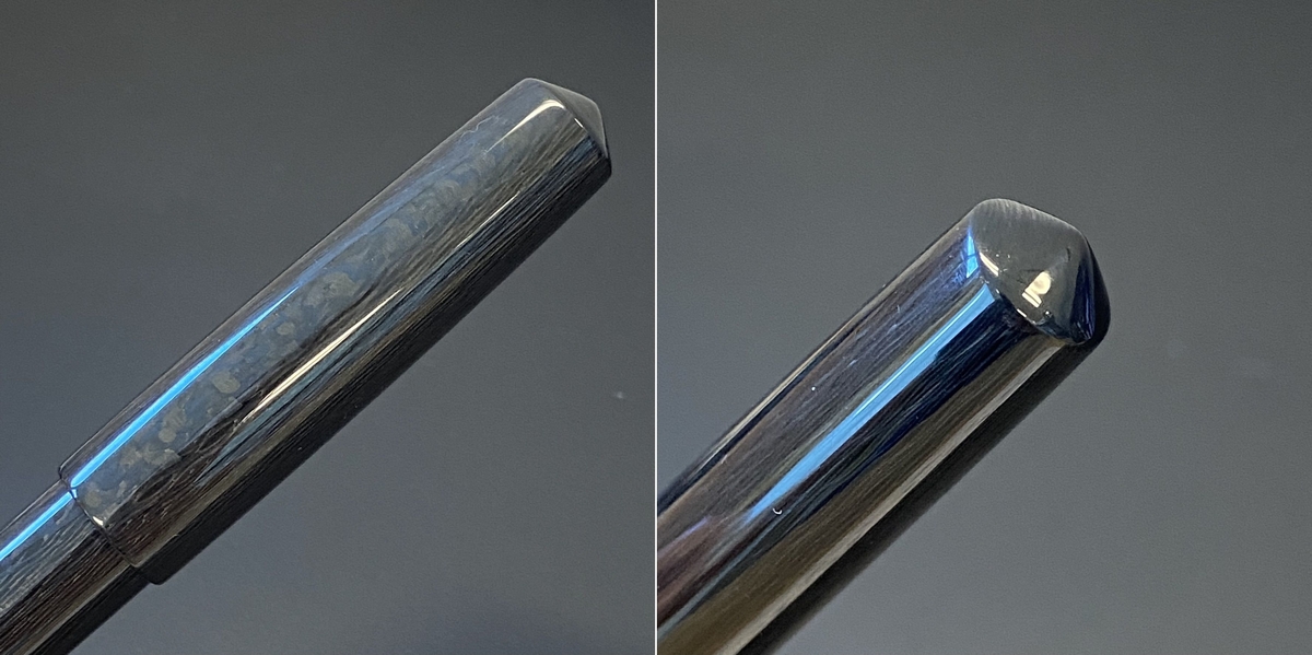 Если честно, когда я впервые увидел эту ручку, подумал, что она сделана из эбонита или какого-то необычного пластика (что за инструмент ко мне едет, не знал до последнего, поэтому заранее прочитать о нём не мог). Но на тактильном уровне материал ощущался иначе, непривычно: немного холодный, нагревался в руках не так скоро, как акрил/пластик/эбонит, но гораздо быстрее металла, очень «звонкий».