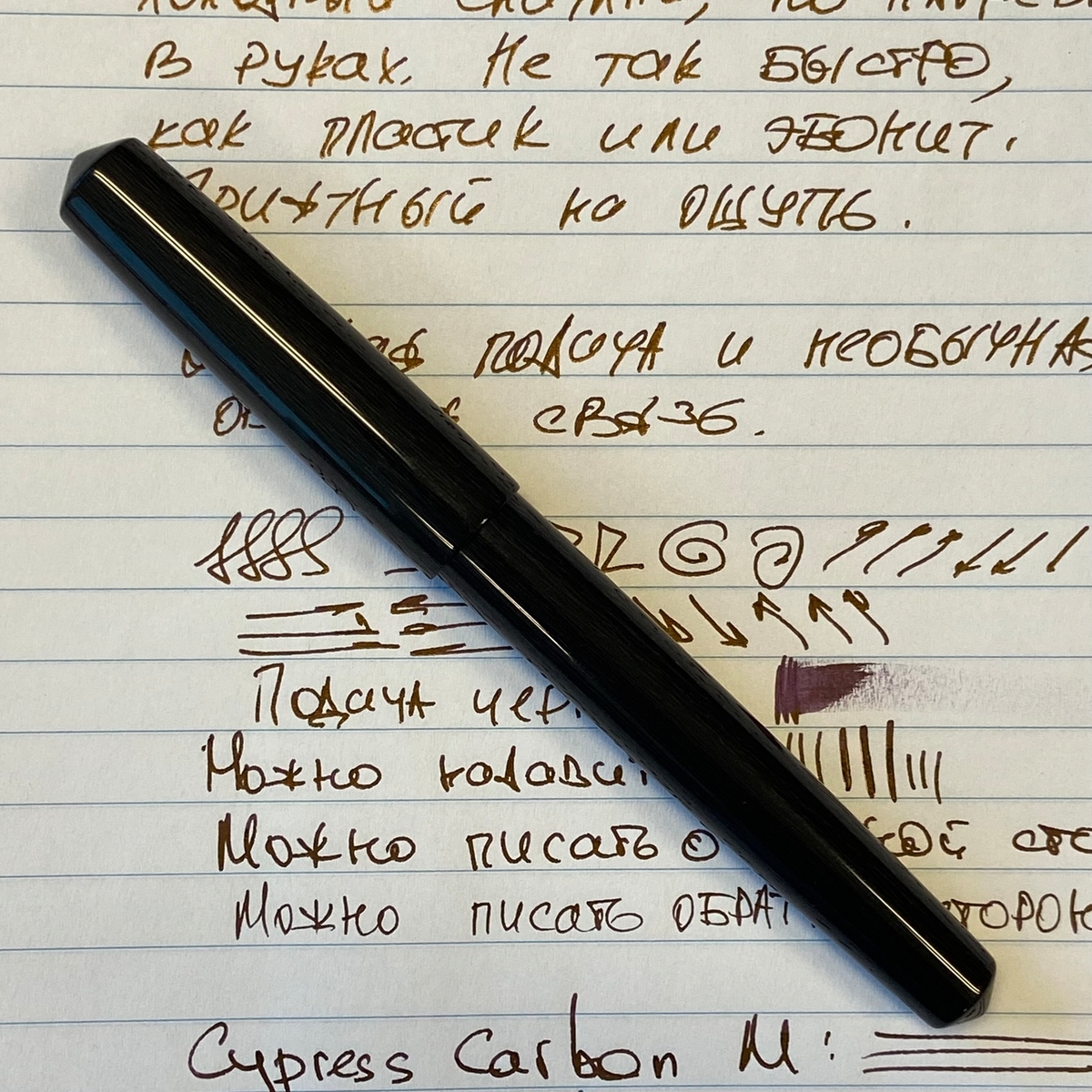 Тайваньская Cypress Carbon Black — ручка безусловно интересная. Более всего обращает на себя внимание материал, из которого она сделана, — не совсем типичный для пишущих инструментов углепластик: прочный, в меру лёгкий и необычно ощущающийся в руке.