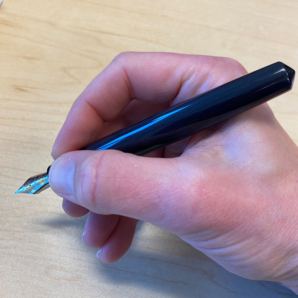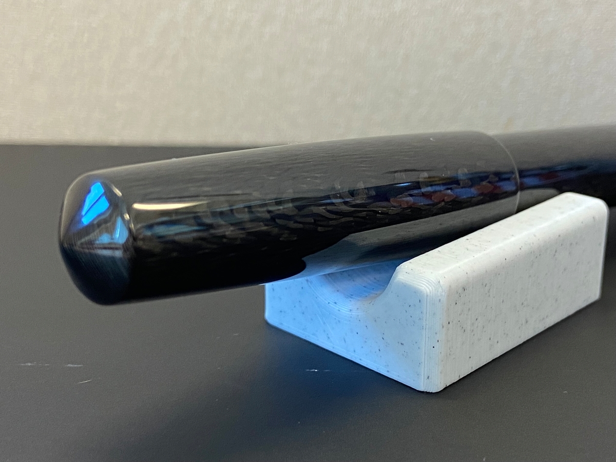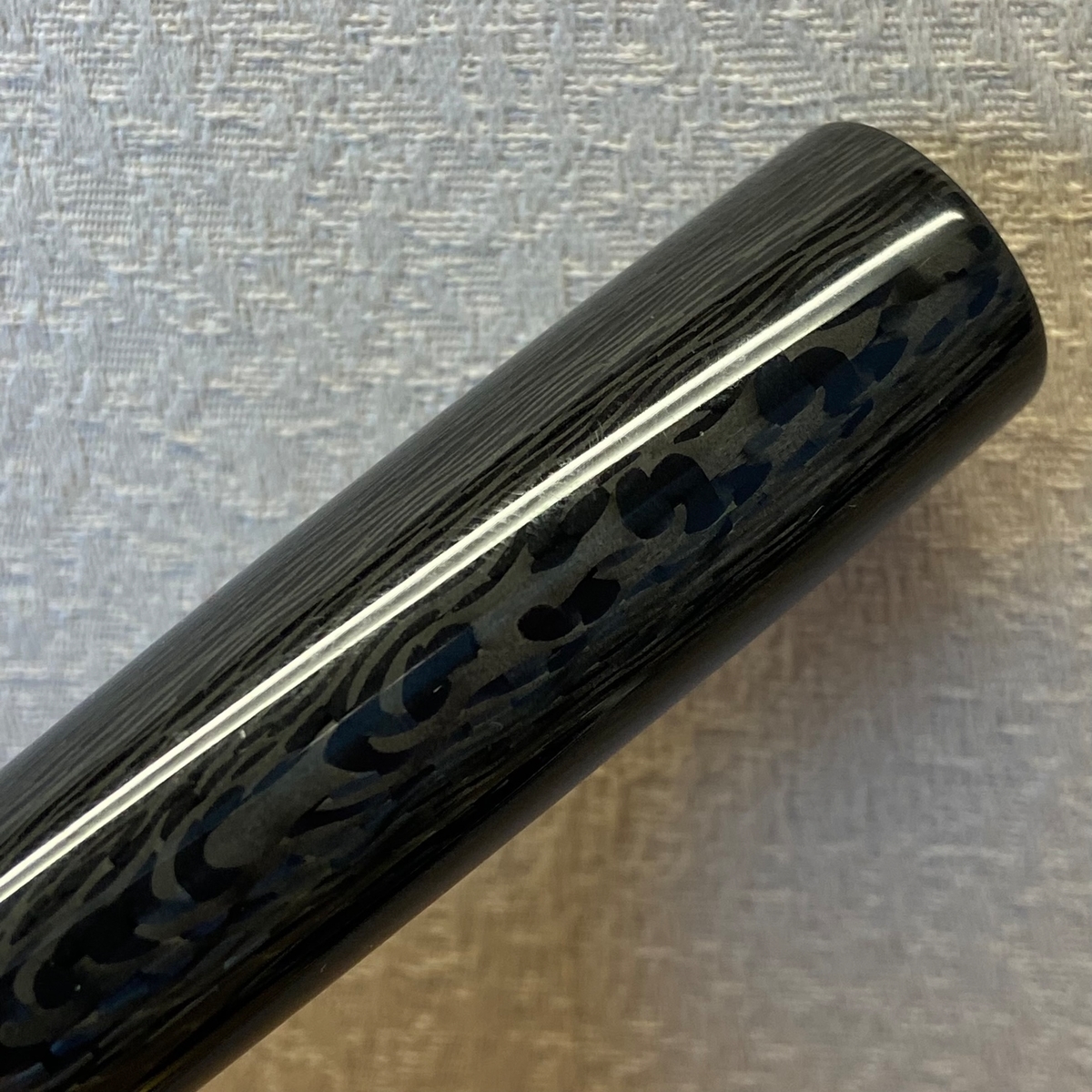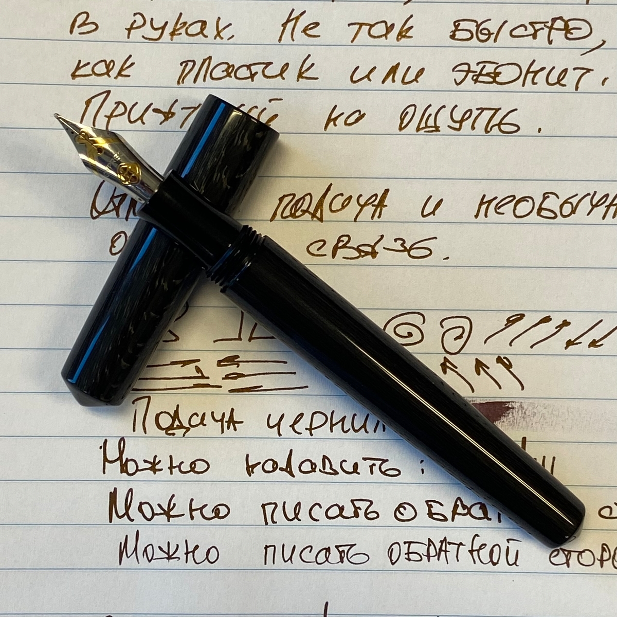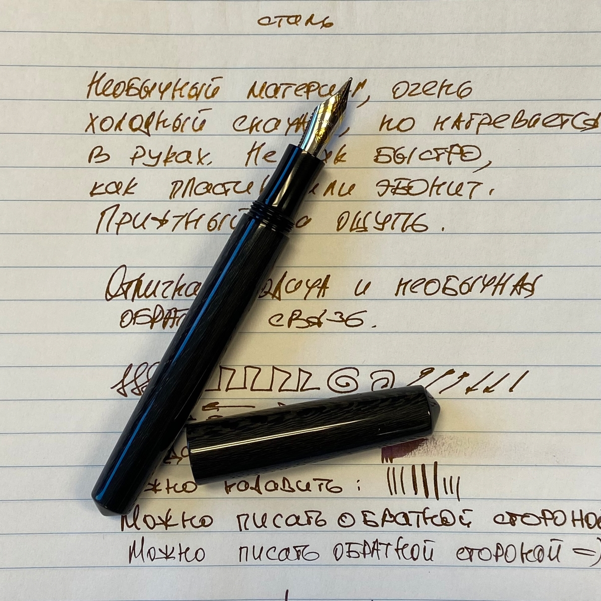Если честно, когда я впервые увидел эту ручку, подумал, что она сделана из эбонита или какого-то необычного пластика (что за инструмент ко мне едет, не знал до последнего, поэтому заранее прочитать о нём не мог). Но на тактильном уровне материал ощущался иначе, непривычно: немного холодный, нагревался в руках не так скоро, как акрил/пластик/эбонит, но гораздо быстрее металла, очень «звонкий».