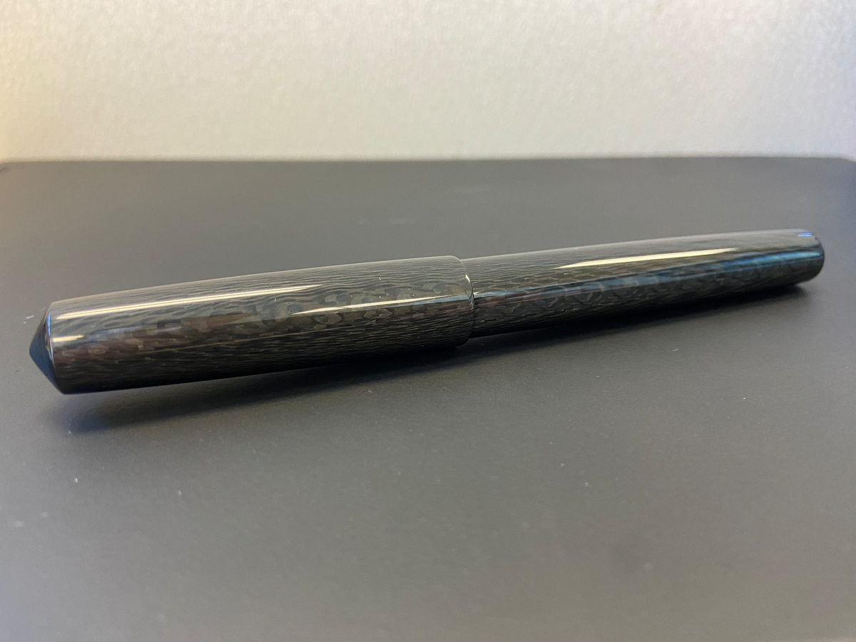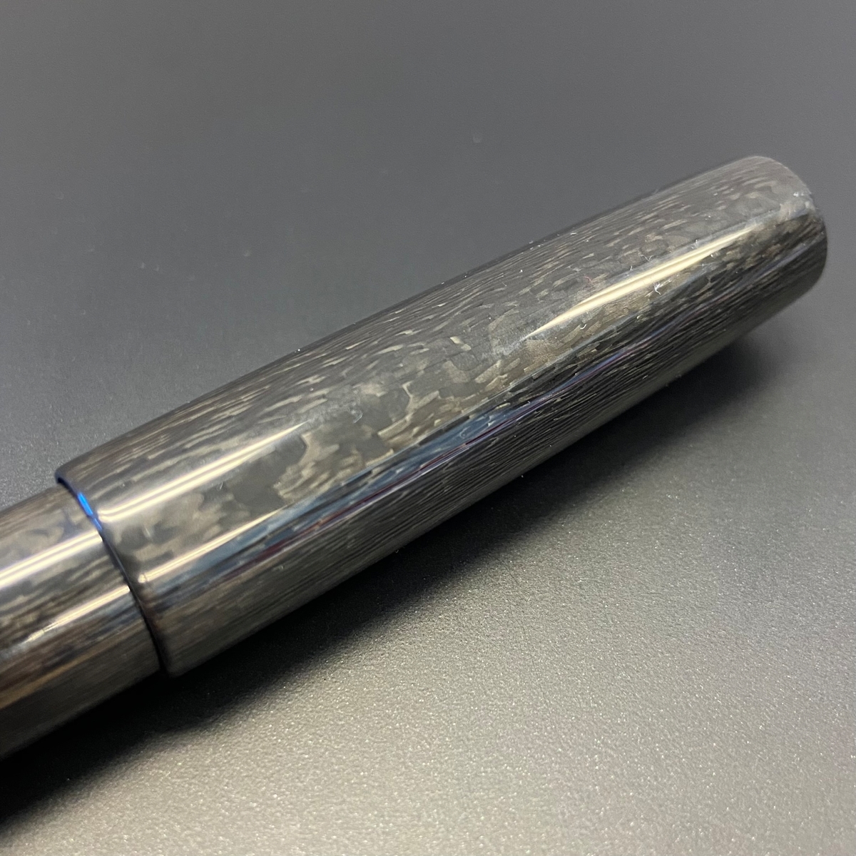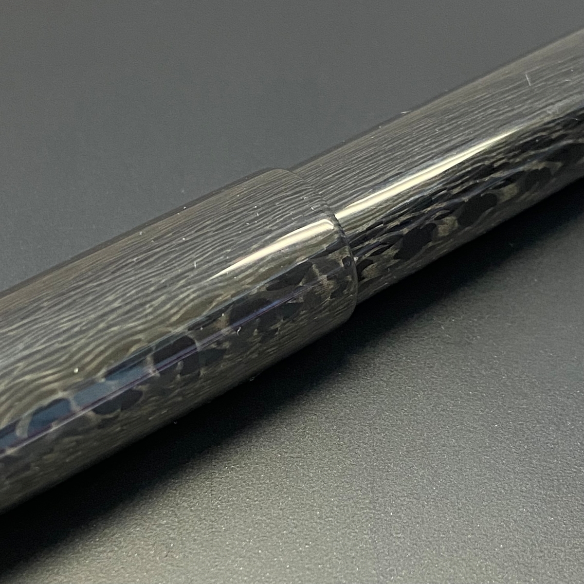 Корпус Cypress Carbon Black сделан из углепластика (карбона). Это полимерный композитный материал из переплетённых нитей углеродного волокна, расположенных в матрице из полимерных смол. Он обладает высокими жёсткостью и прочностью, а также малой массой на единицу объёма. Для перьевых ручек самое то: не разобьётся и не сломается при падении, не добавит лишнего веса при письме.