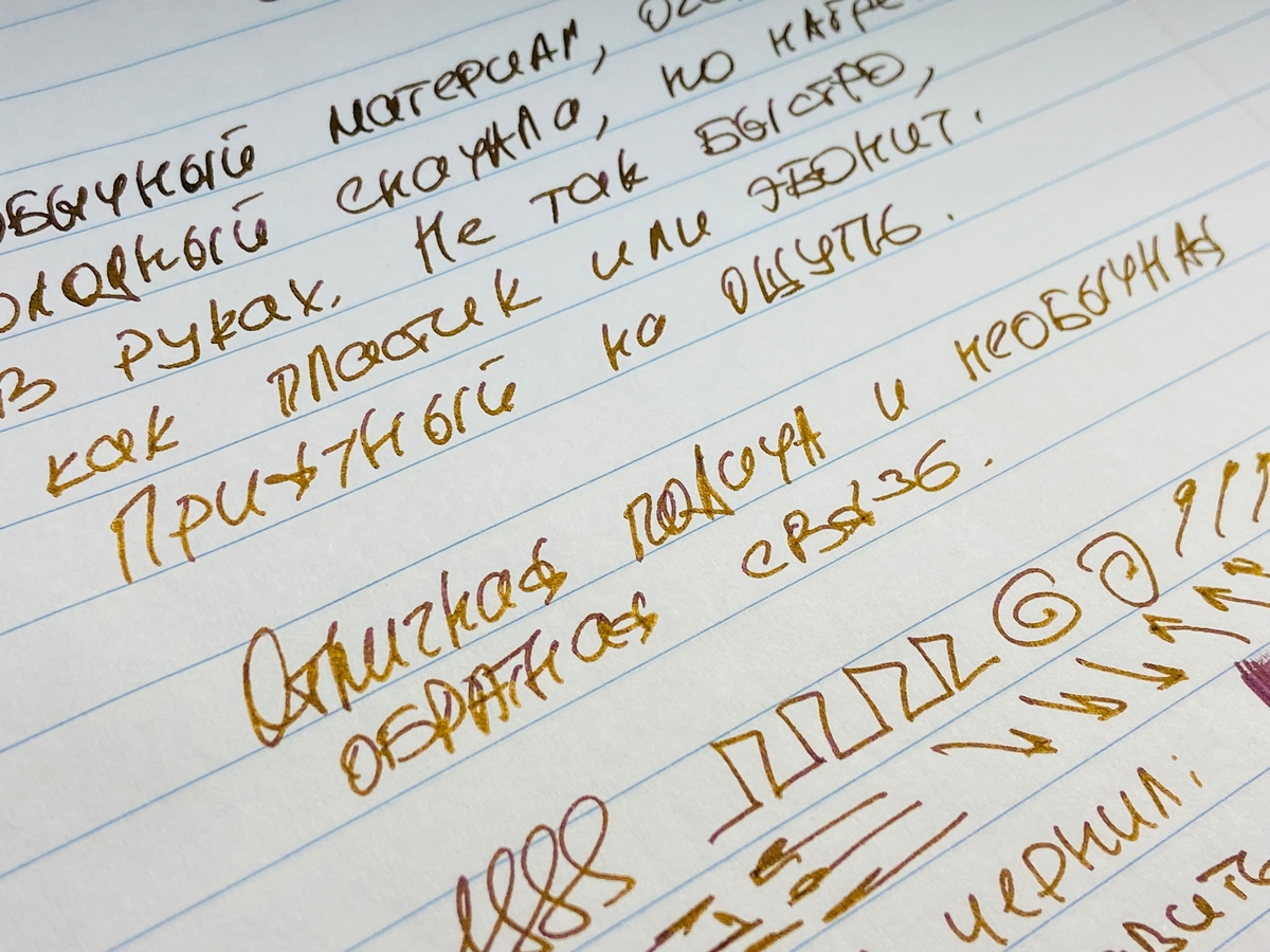 Никаких царапаний бумаги и прочих распространённых проблем нет. На перо можно чуть надавить: оно пружинисто-упругое, но не флексовое. Получается писать обратной стороной: линия становится тоньше.