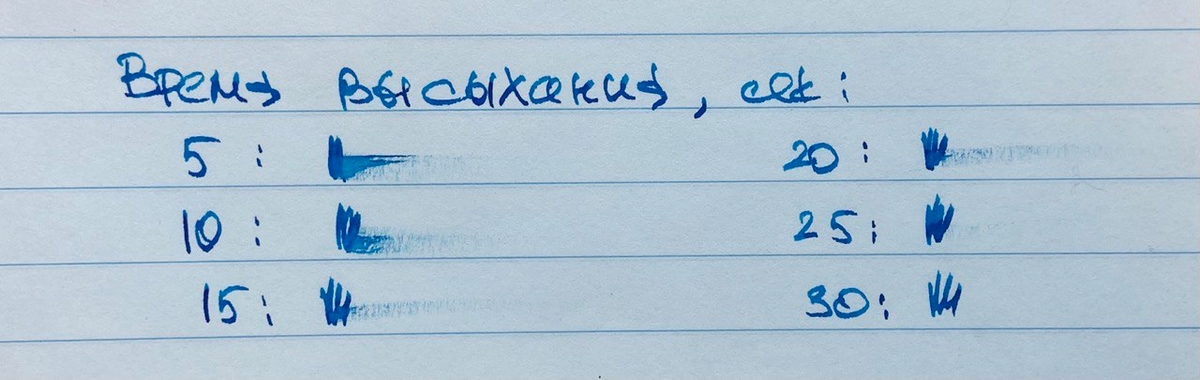 Второй тест — на офисной бумаге не самого высокого качества. Результат плюс-минус такой же. Физеринг не появляется, если перо вовремя отрывать от поверхности.