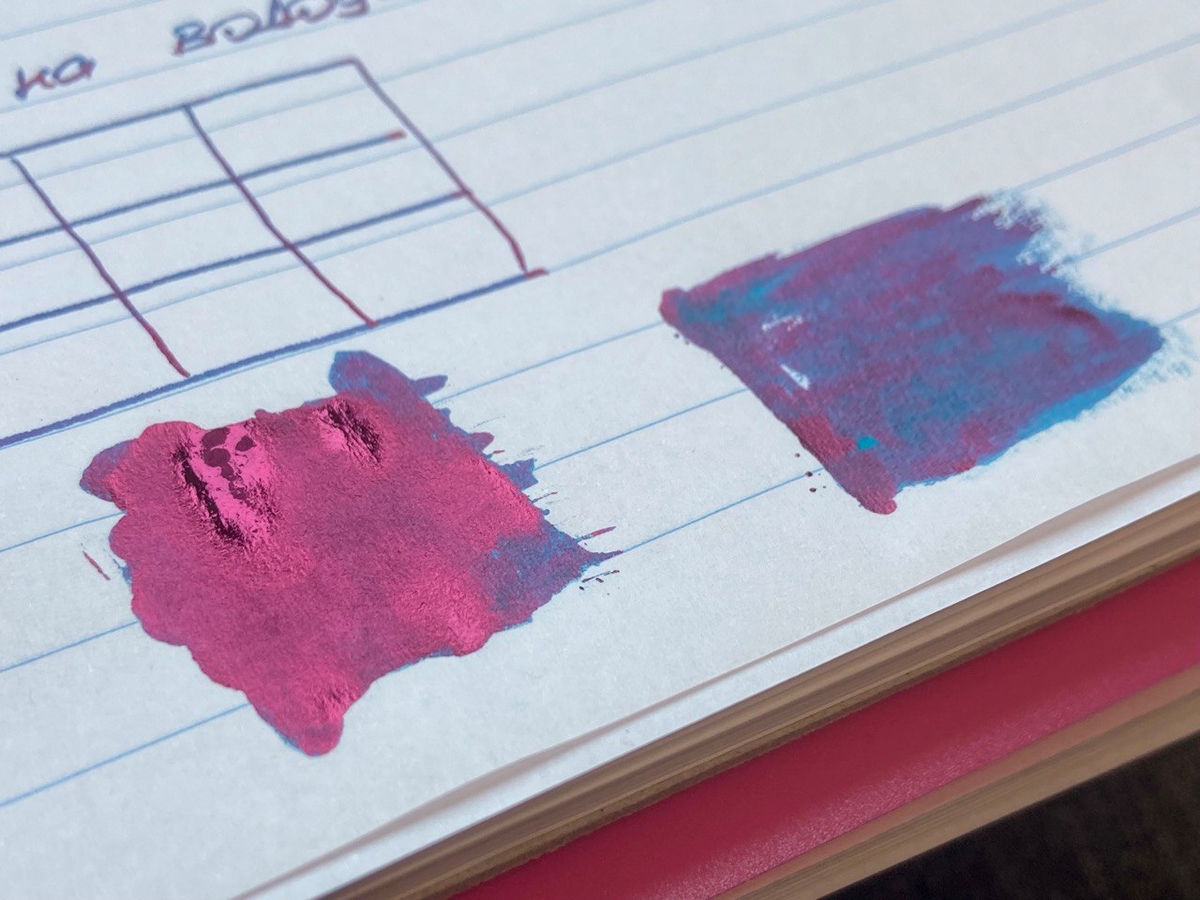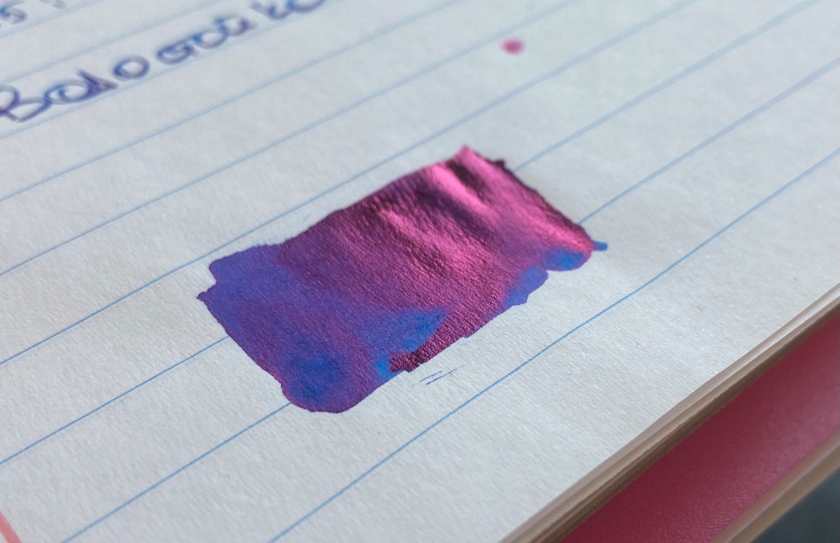 Присутствует шин, то есть на свету чернила дают фиолетово-золотистый блеск. Особенно заметен он при правильном сочетании ручки/пера и бумаги.