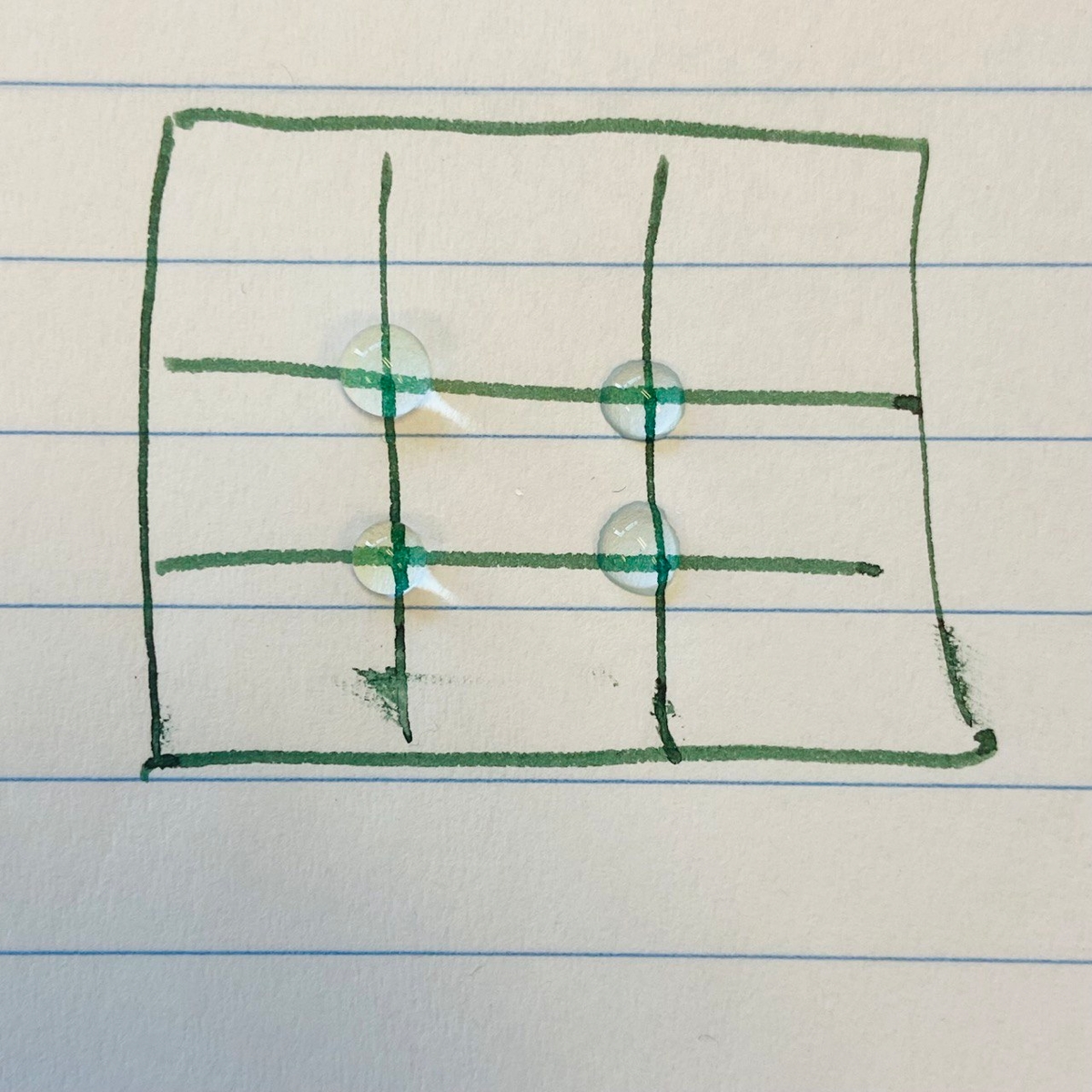 Никакого шина тут нет, однако Tramol Swing приятно удивили другим свойством (полезным, что немаловажно!), о котором я сначала не знал, — водостойкостью. Смотрите сами: наносим на нарисованную сетку капли воды и… ничего! Совершенно!