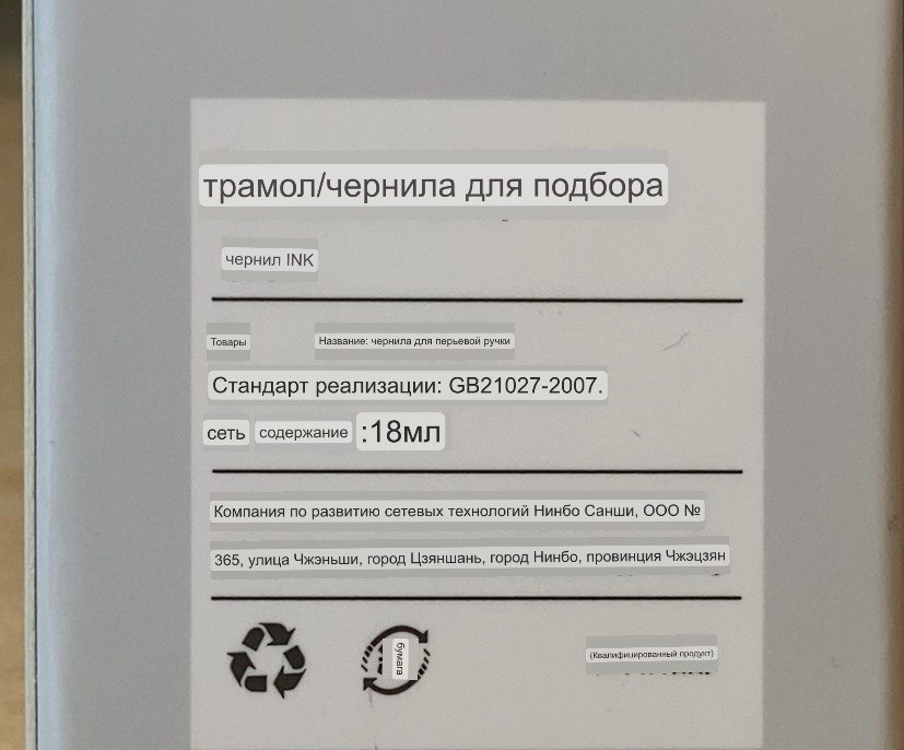 Сбоку информация на китайском языке, что это чернила для перьевых ручек, указаны стандарт реализации, объём флакона (18 мл), название и адрес производства, есть значок вторичной переработки.