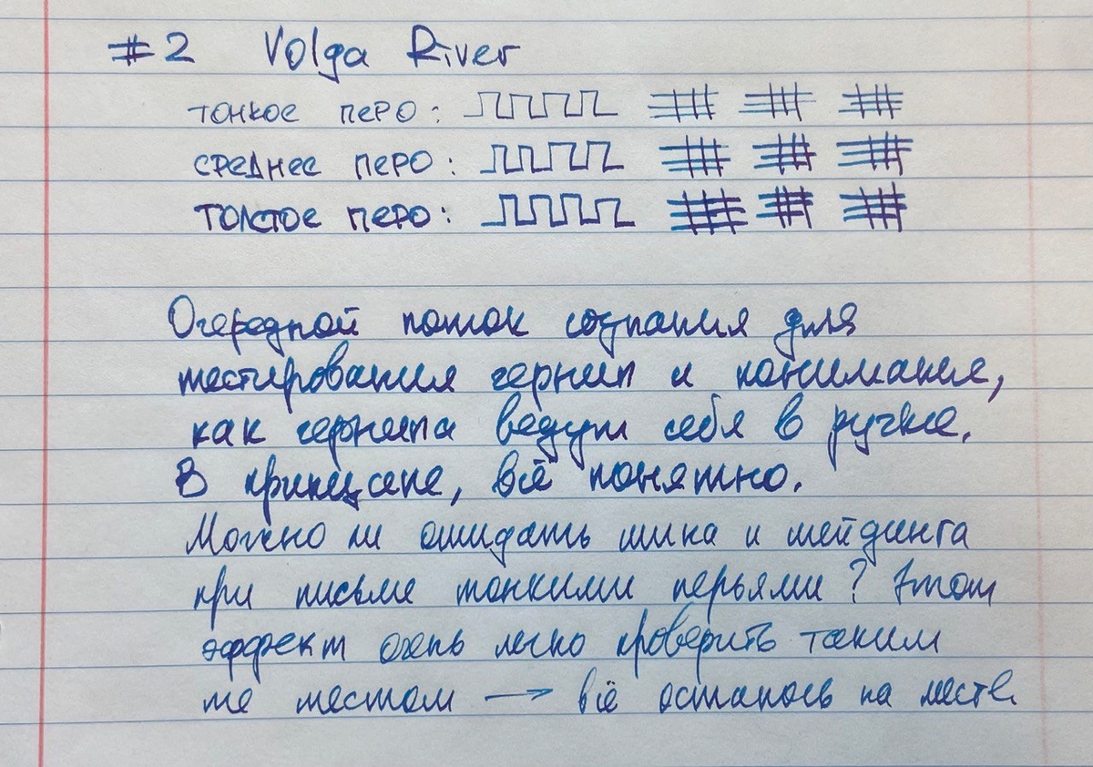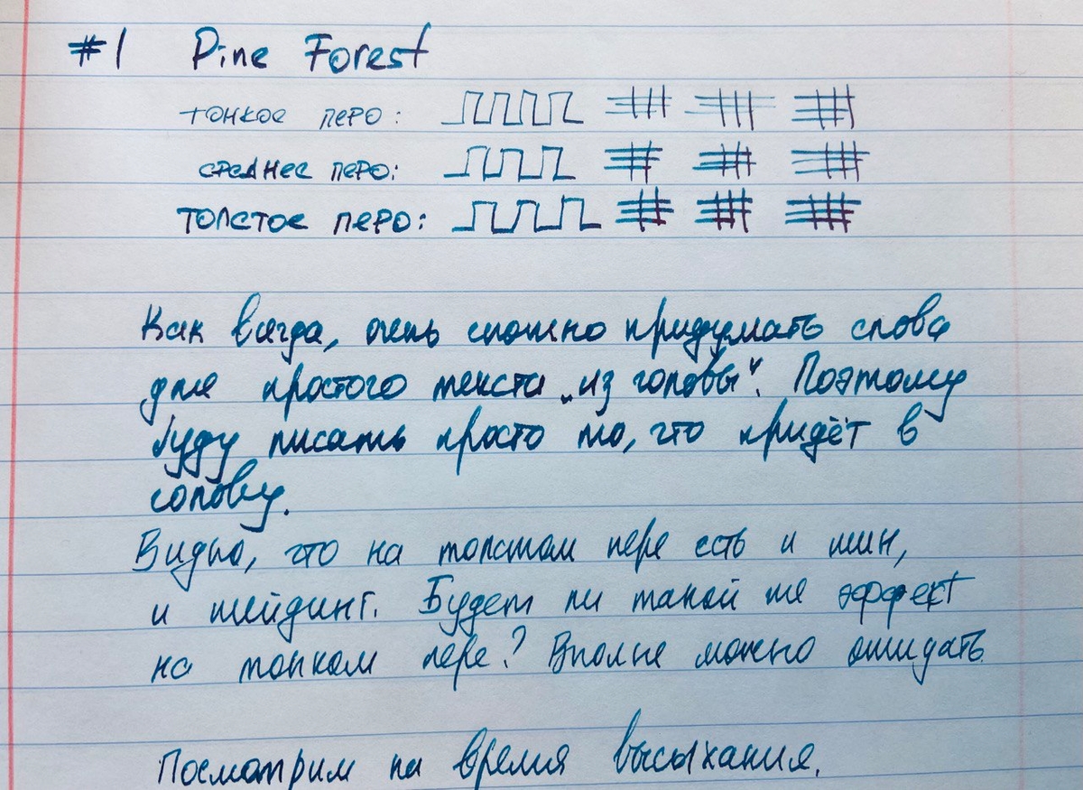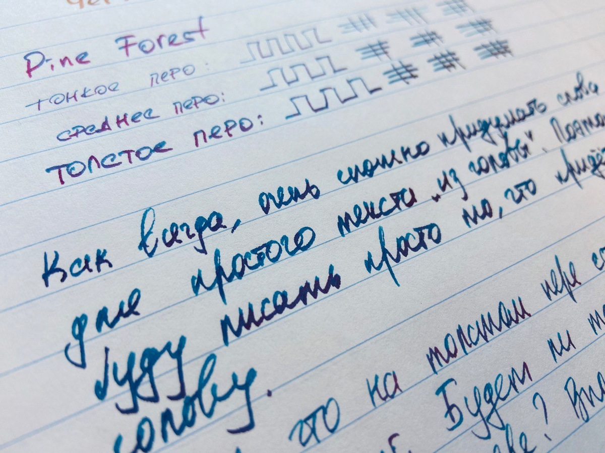 Чернила ведут себя ожидаемо одинаково на разных перьях, пишут немного суховато, высыхают быстро.