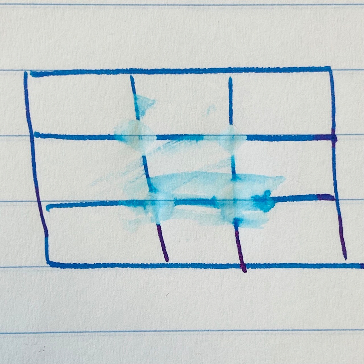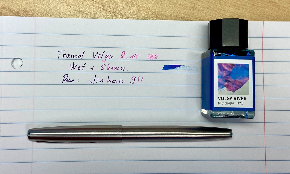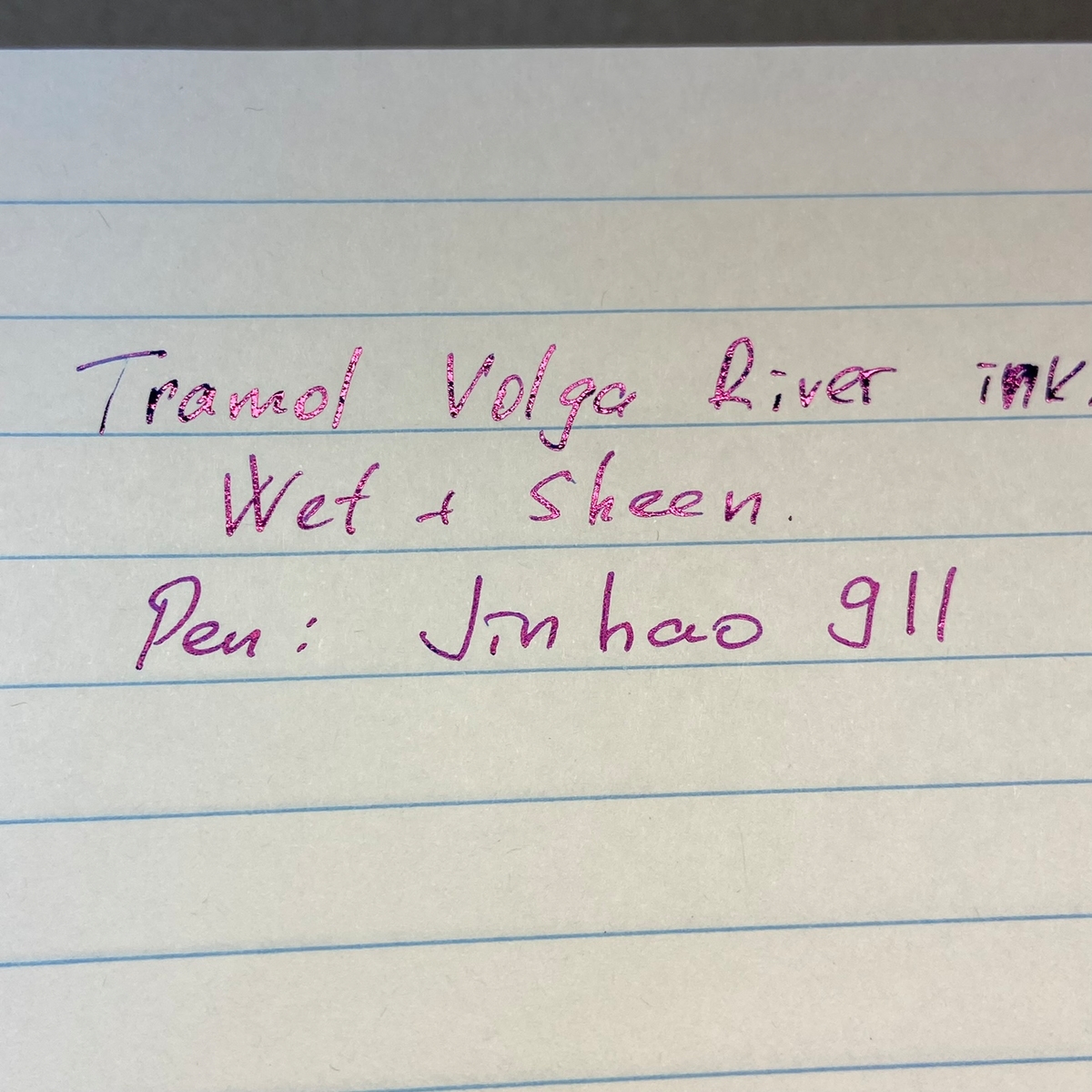 Присутствует шин, то есть на свету чернила дают фиолетово-золотистый блеск. Особенно заметен он при правильном сочетании ручки/пера и бумаги.