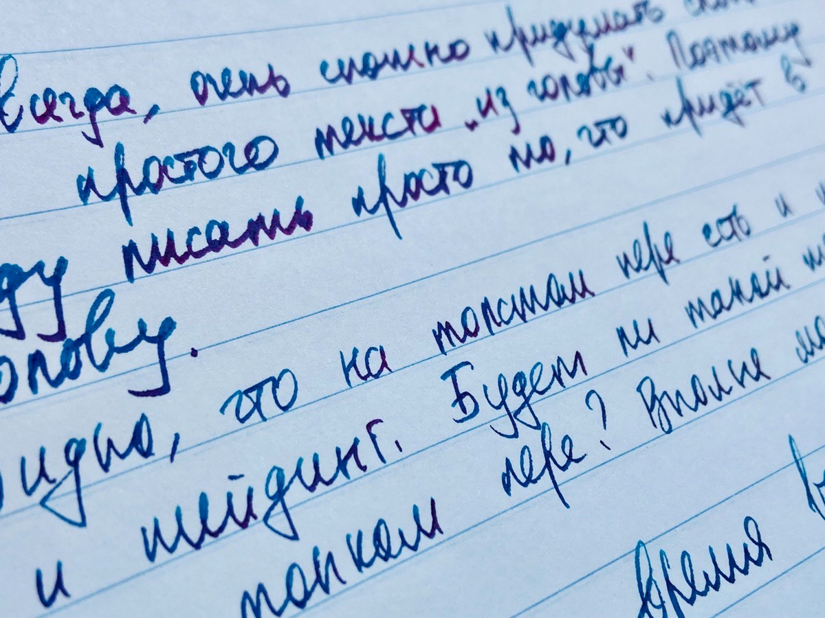 Чернила умеренно жидкие, даже больше густоватые. Писать ими приятно. Одинаково понятно ведут себя на перьях всех толщин.