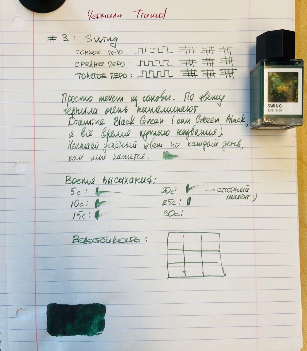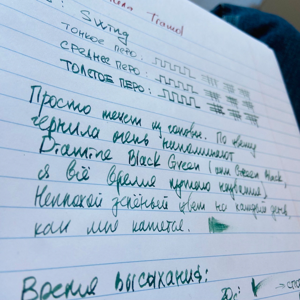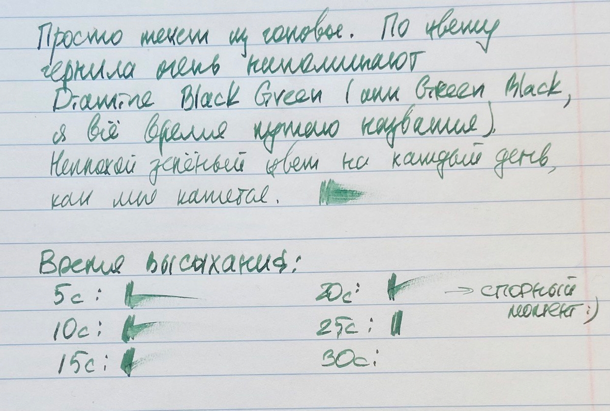 Оттенок тут… ну-у-у… пусть будет грязно-зелёный. :) Моему глазу нравится. Очень похож на Diamine Black Green по выкраскам.
