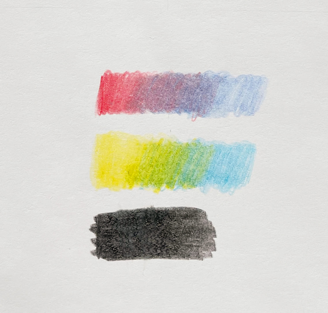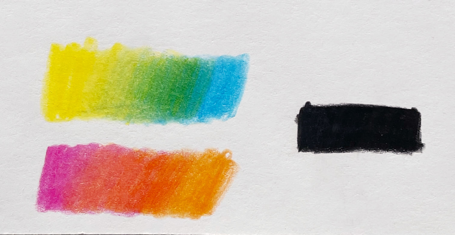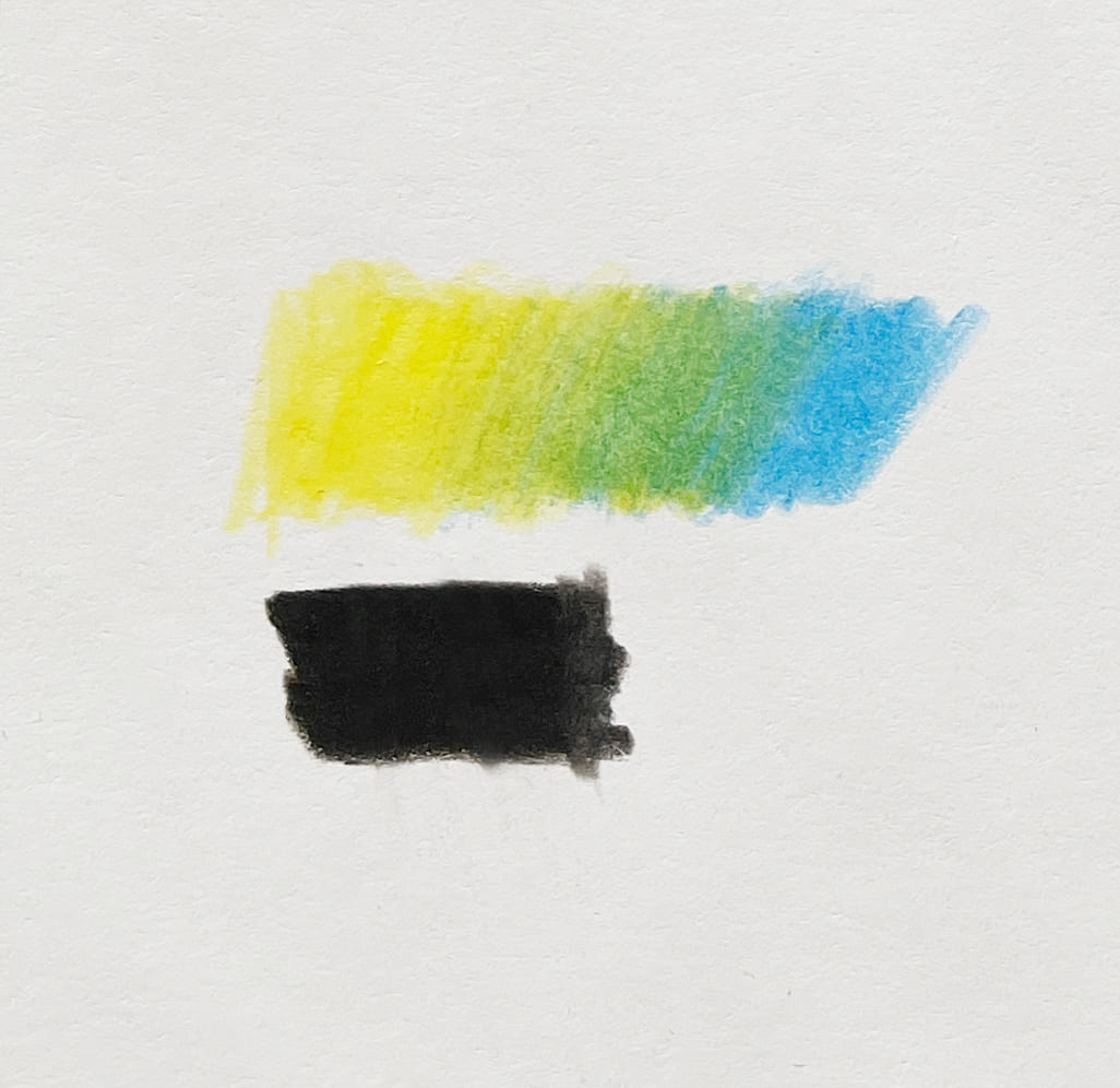 Ниже можете посмотреть результаты тестов: карандаши неплохо смешиваются (классический микс из синего и жёлтого даёт яркий зелёный), чёрный средней насыщенности — скорее, тёмно-серый.