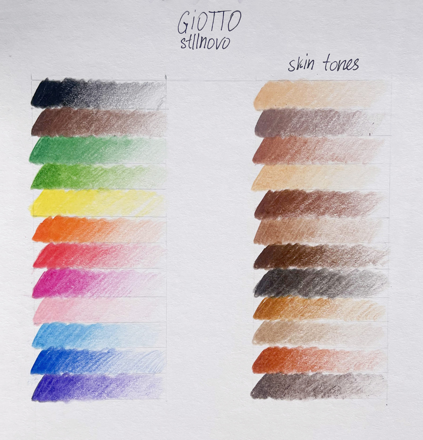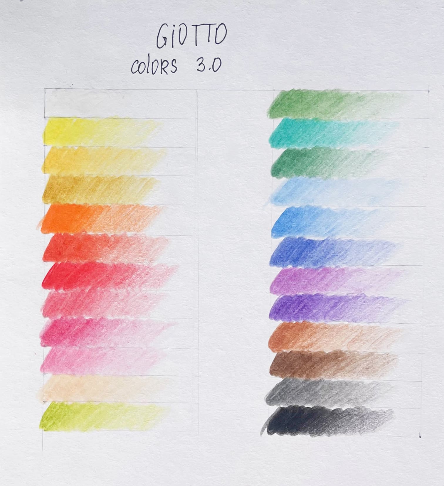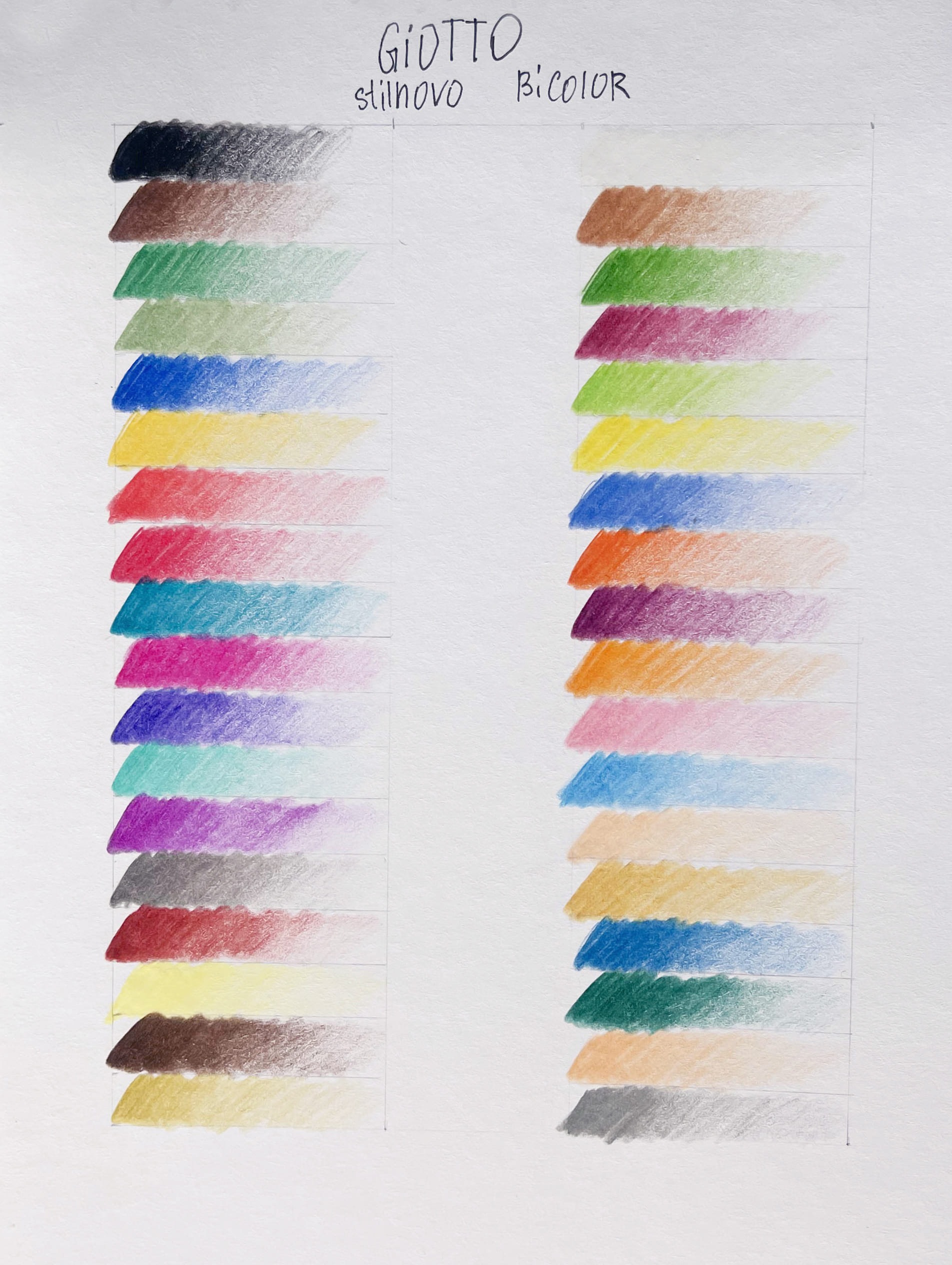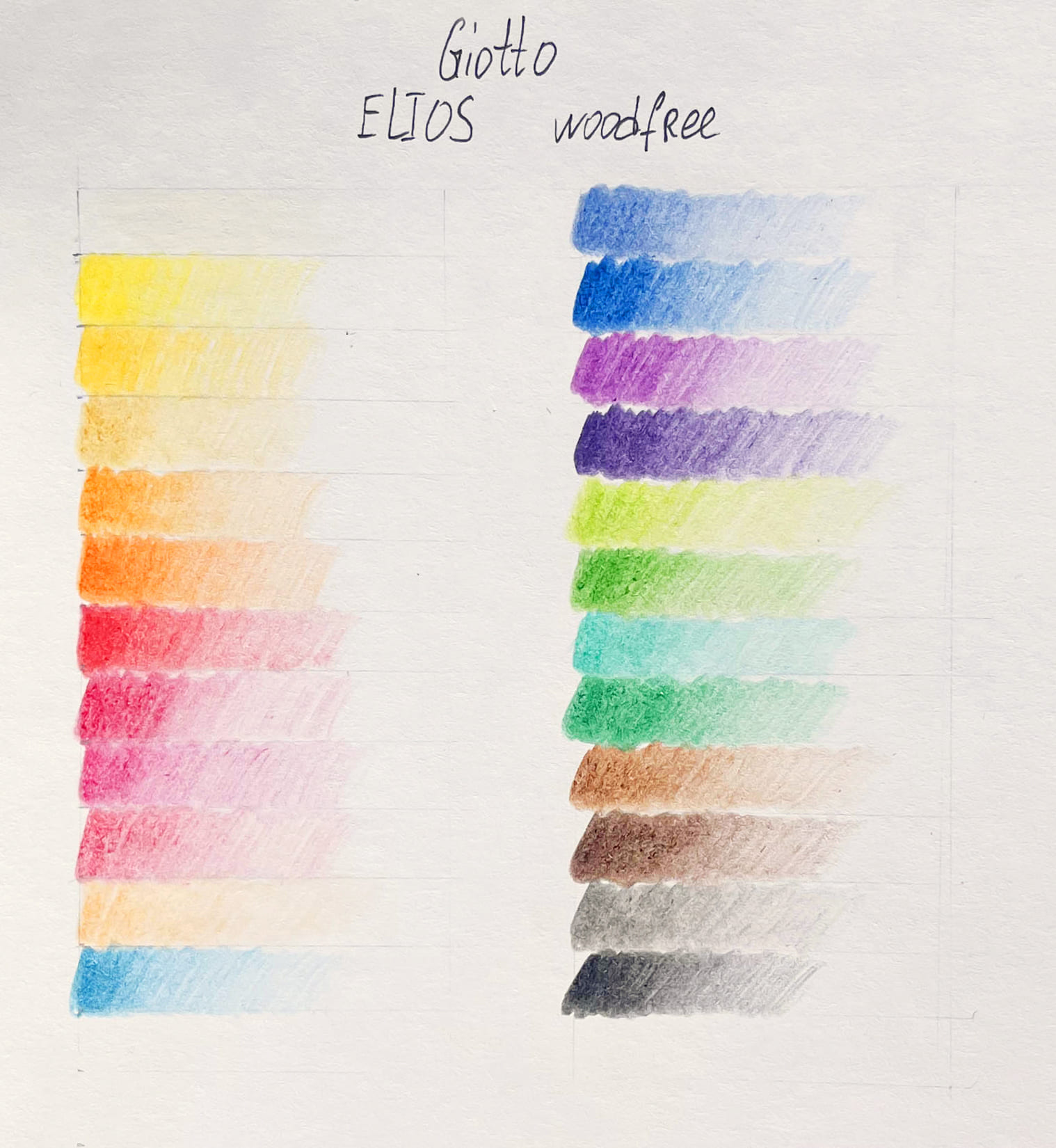 Попробовав все цвета, могу с уверенностью сказать, что грифель ощутимо ярче и мягче в сравнении с GIOTTO Elios. Это можно заметить по характеру нанесения на бумагу: оттенки ложатся равномернее, видно меньше штрихов, они более укрывистые — лучше перекрывают бумагу. Разве только нескольких это не касается: например, салатового (нижний в первом столбце на фото выше).