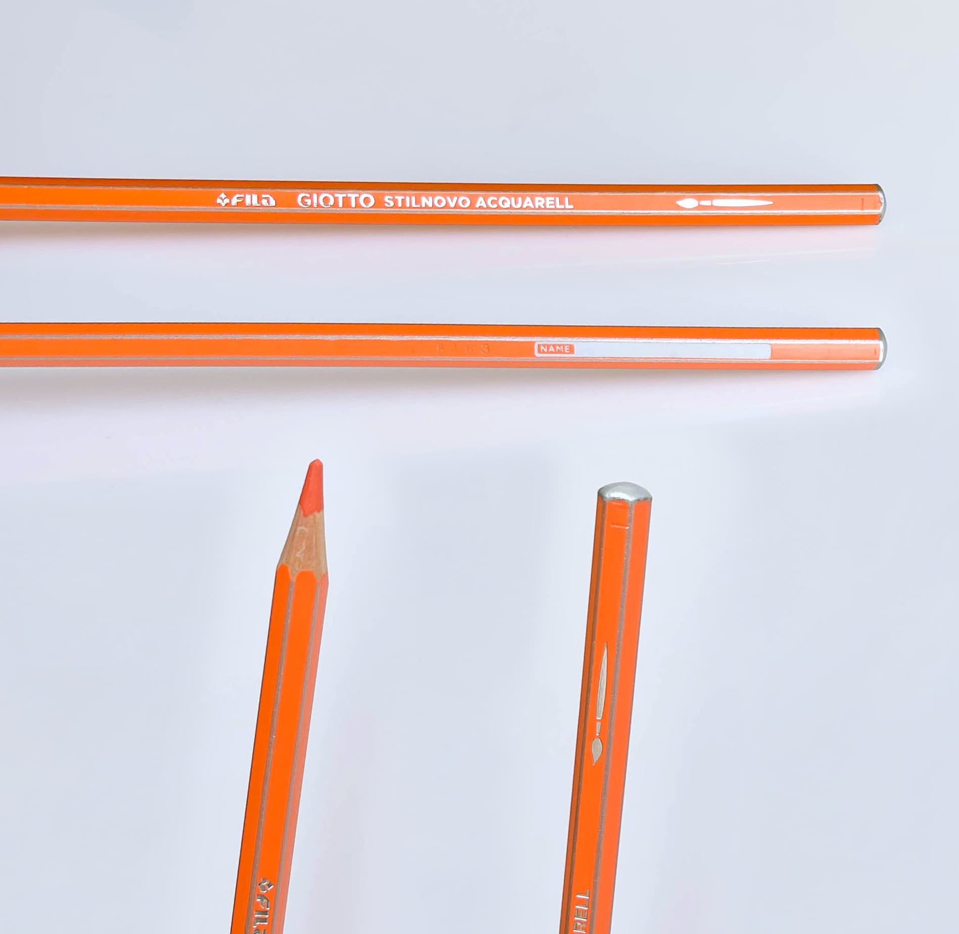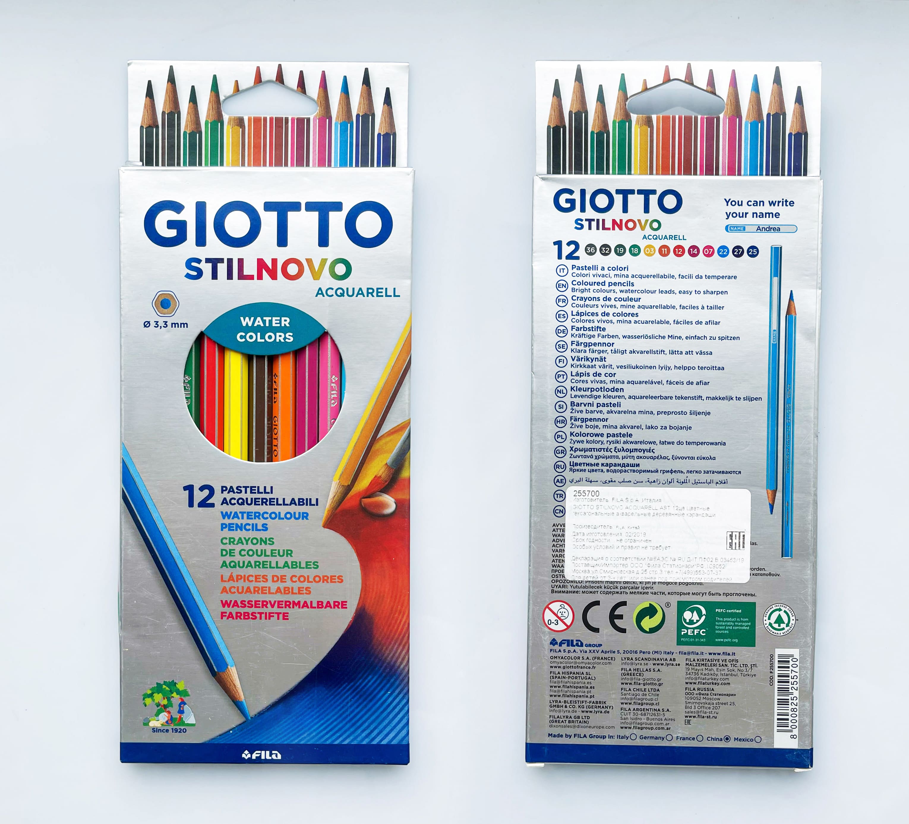 Акварельные карандаши Stilnovo выглядят так же, как простые цветные: шестигранные; линии между гранями, надписи и обратная сторона (торец) серебристые; есть место для персонализации. После названия значок кисти. Толщина грифеля — 3,3 мм.