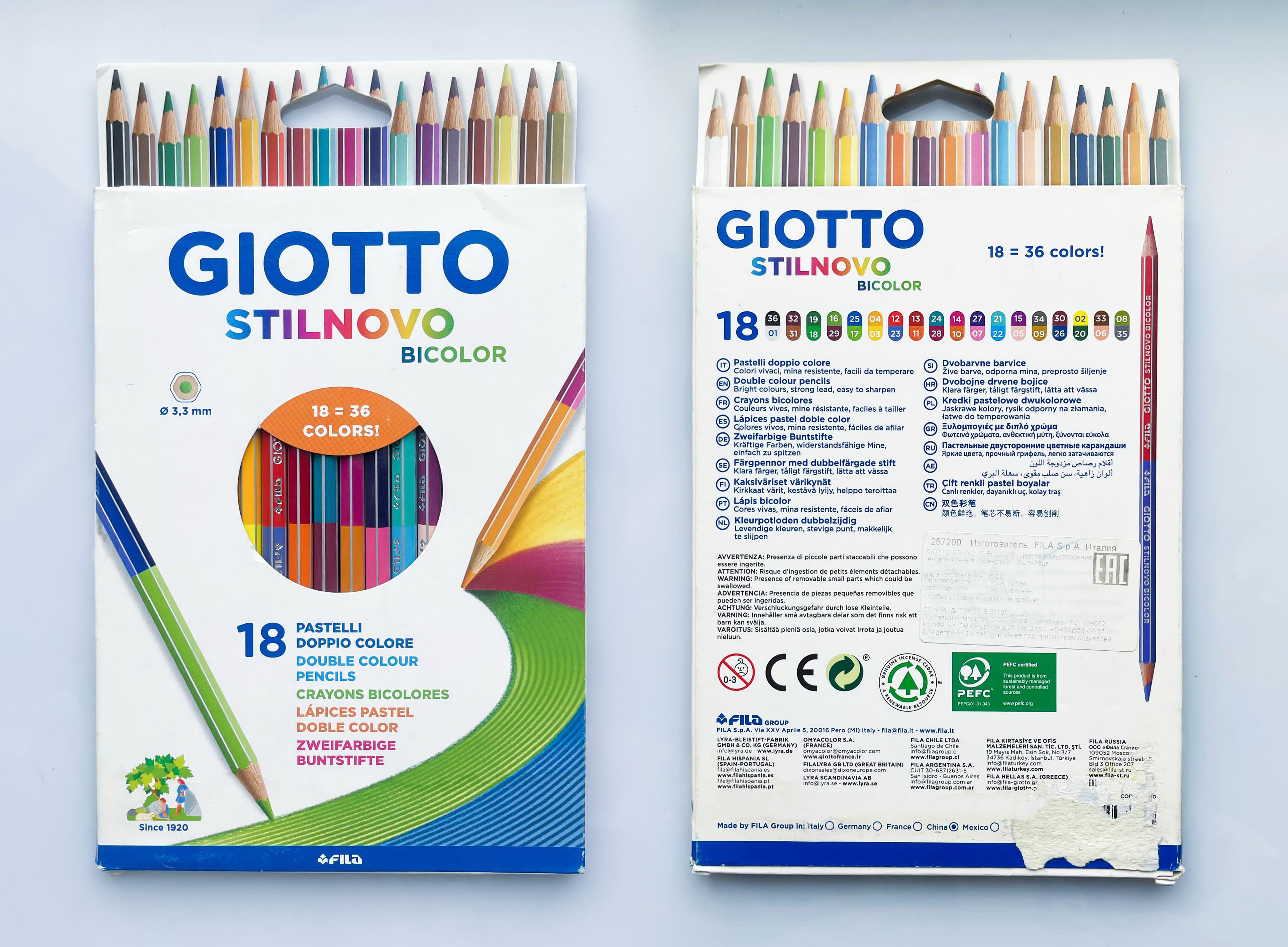 Bicolor — компактный вариант, занимающий в два раза меньше места в пенале и продающийся в наборах по 12 карандашей (24 цвета) и 18 карандашей (36 цветов — он у меня).