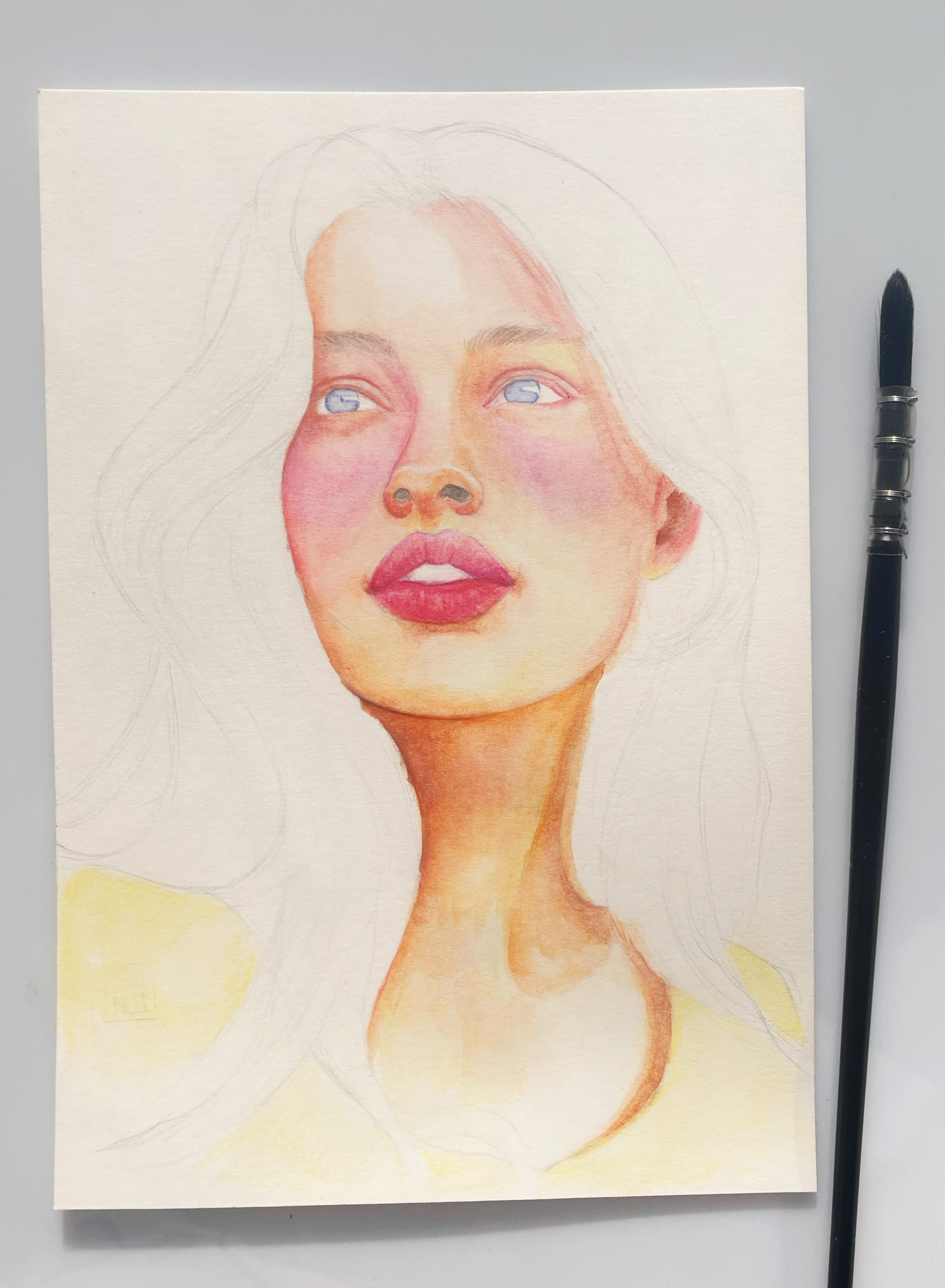 Это, кстати, справедливо и для второго слоя: лучше дожидаться полного высыхания поверхности бумаги, прежде чем использовать сухой материал. Ещё вариант — набирать цвет тонкой и жёсткой кистью прямо с грифеля карандаша и наносить: оттенок получится темнее и ярче. Я использовала этот метод для добавления тёмных участков на веках и на носу.