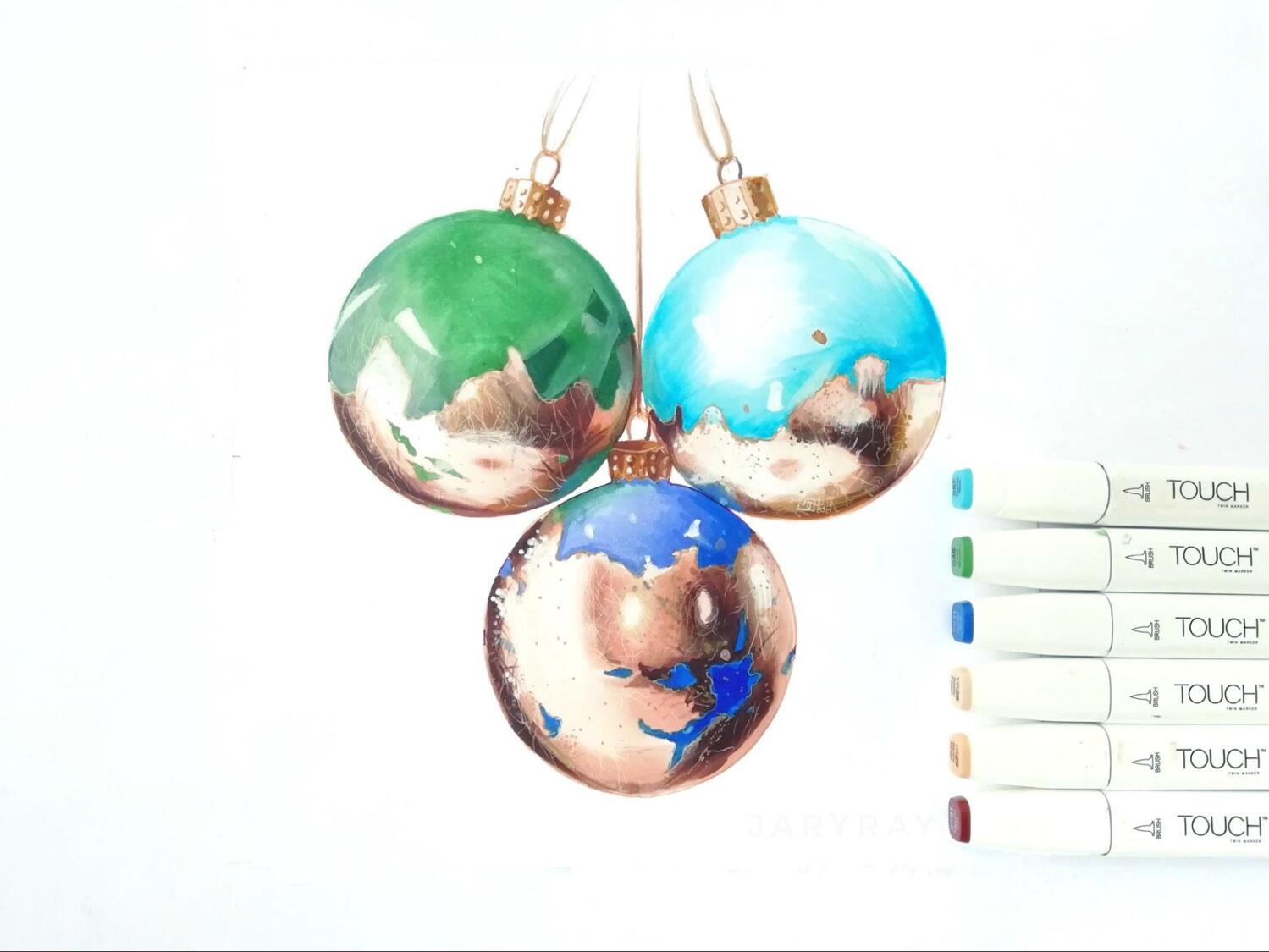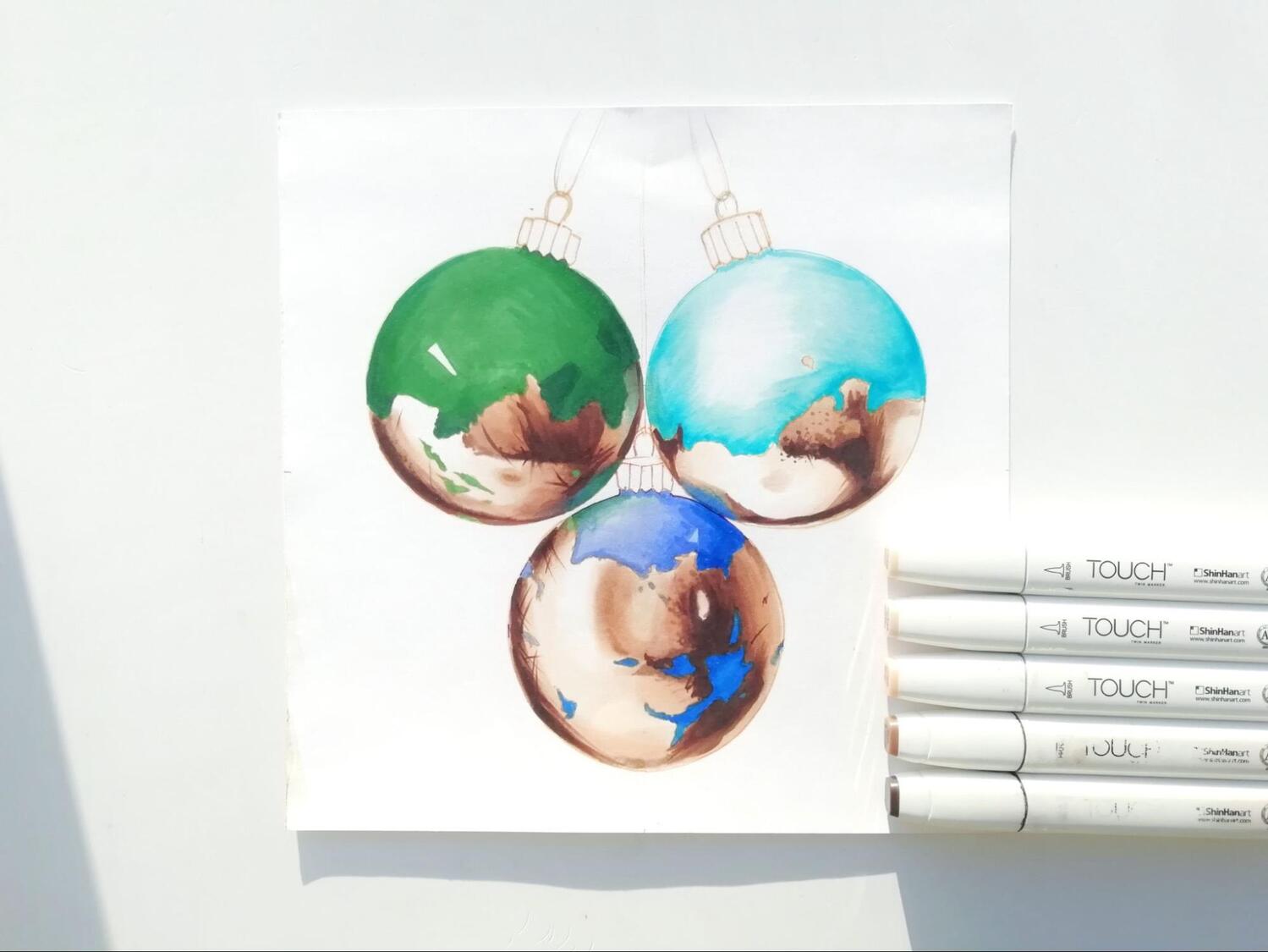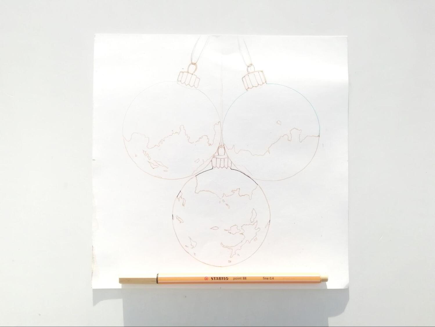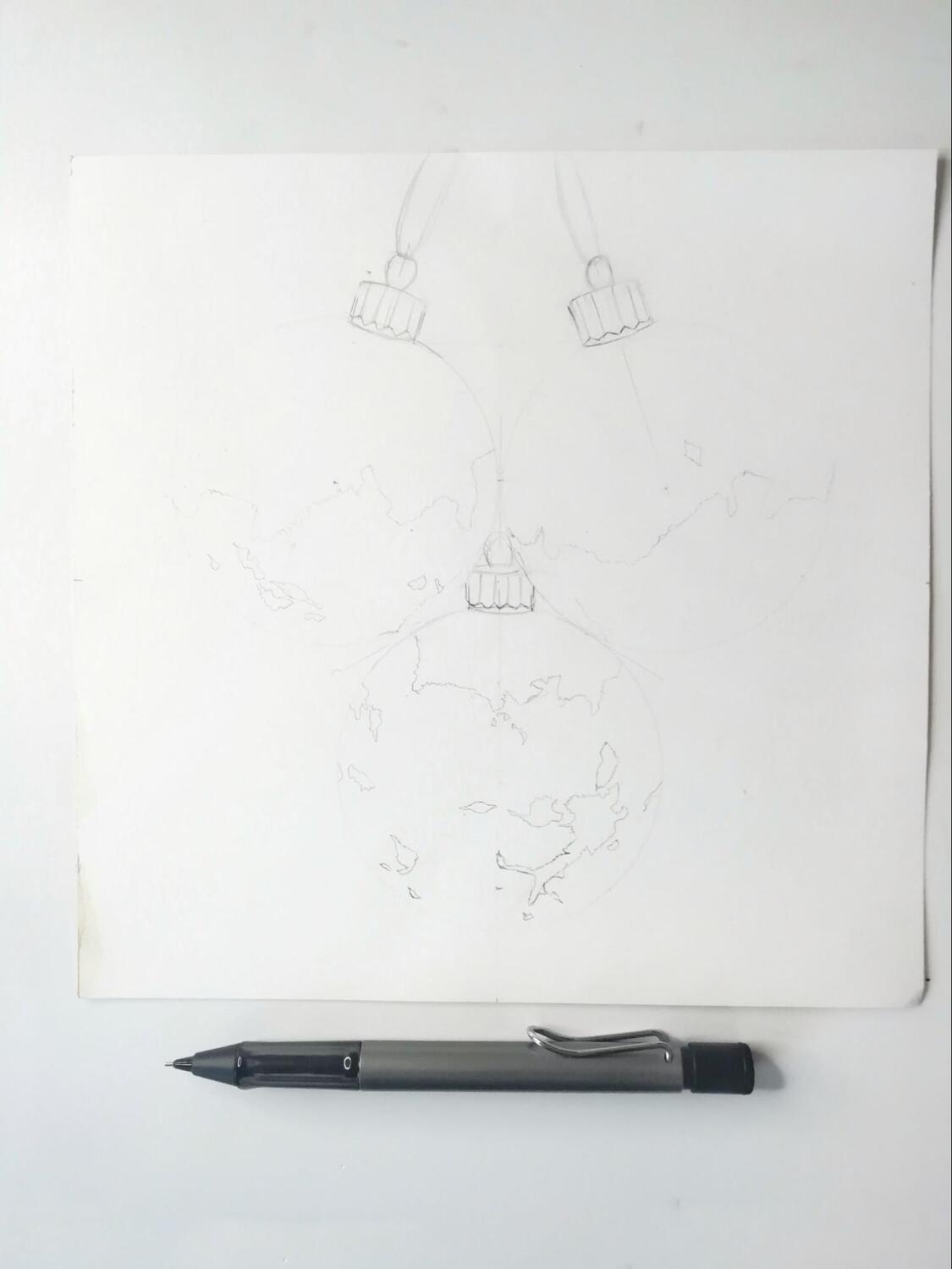 Я решил изобразить ёлочные игрушки, используя при этом как можно больше оттенков, чтобы лучше продемонстрировать возможности маркеров. Но последние вступают в дело не сразу. Карандашный эскиз — то, с чего нужно начать.