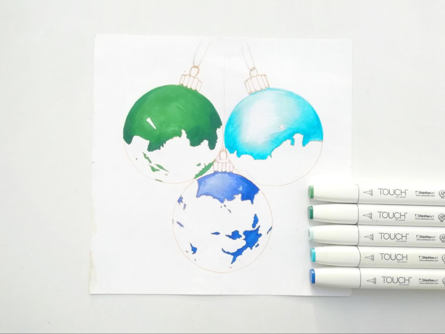 Стартую с корпусов в целом, золото — на десерт. Мой набор маркеров Touch достаточно большой, поэтому каждый шар будет своего цвета. Я выбрал три холодных: глубокий синий, голубой и зелёный.
