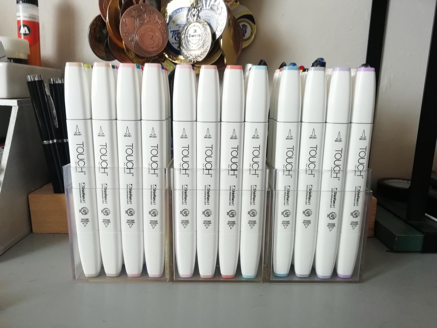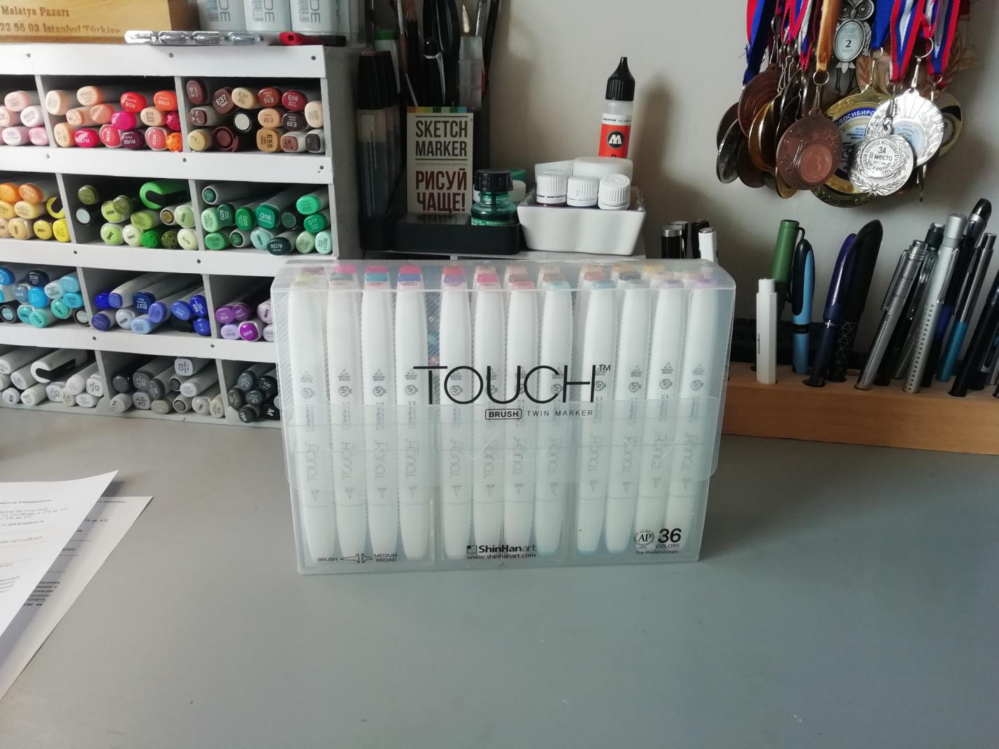 В моём наборе 36 штук — вполне «каноническое» количество для большинства производителей. Маркеры помещены в большую прозрачную пластиковую упаковку со стильной надписью Touch.