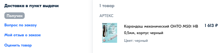 Выбрать можно было из трёх расцветок: чёрный и серебристый под грифель 0,5 мм, синий под 0,3 мм. Если поискать, для грифеля 0,5 мм есть ещё красный и светло-синий, но уже дороже. Я остановился на классическом чёрном варианте.