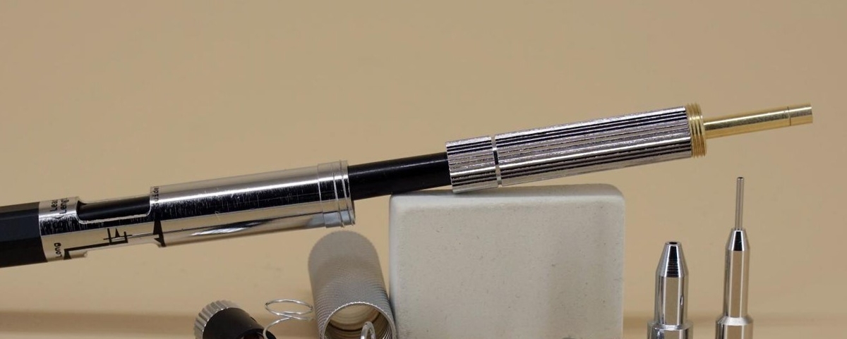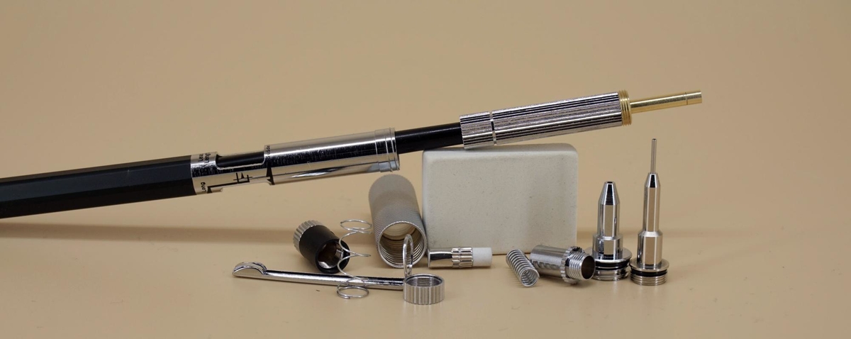 При его вращении цанговый механизм смещается по оси относительно наконечника по латунной резьбе, что приводит к большему или меньшему выдвижению грифеля при захвате его цангой.