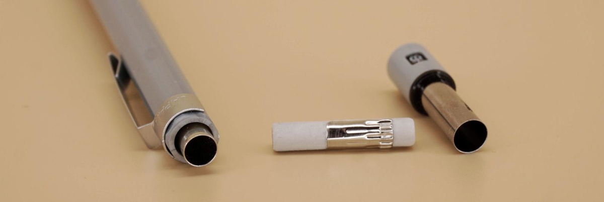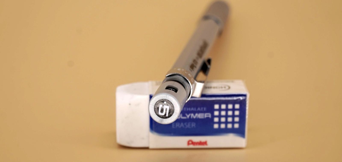 Под кнопкой расположен довольно длинный (21,5 мм) ластик диаметром 4,2 мм в металлической оправке.