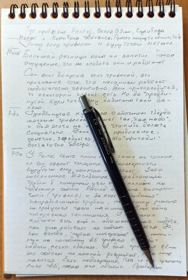 Интересно, что штрихи и линии, которые оставляет на бумаге грифель Pentel Orenz 0.2, за счёт его малой толщины чем-то напоминают таковые от карандашей из линейки Kuru Toga Advance: не зная, каким что было написано, можно легко перепутать.