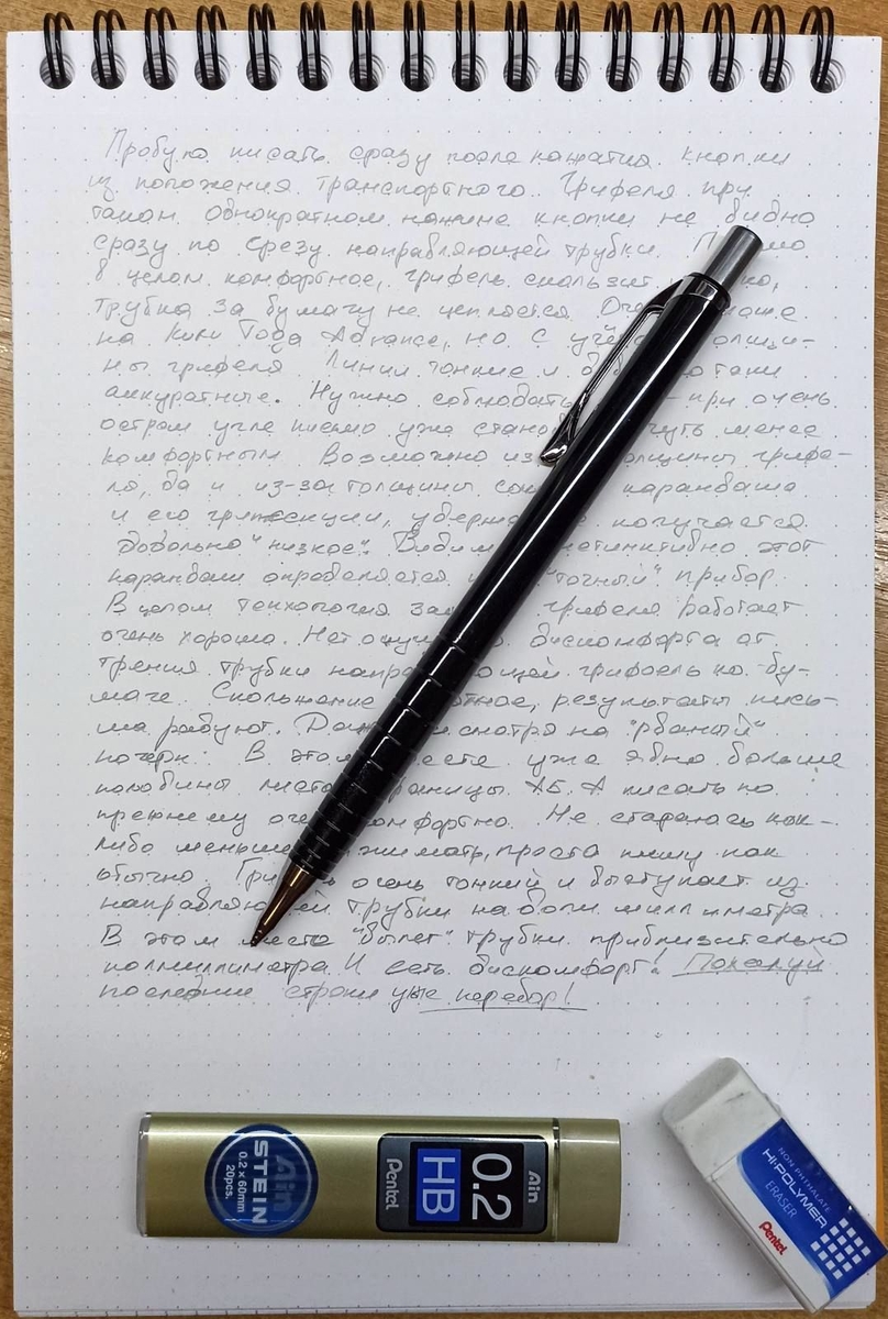 Получилось значительно больше половины страницы A5 мелким почерком. Учитывая толщину грифеля, это отличный результат! Почти одинаково с Kuru Toga Advance Upgrade с твёрдо-мягким грифелем.