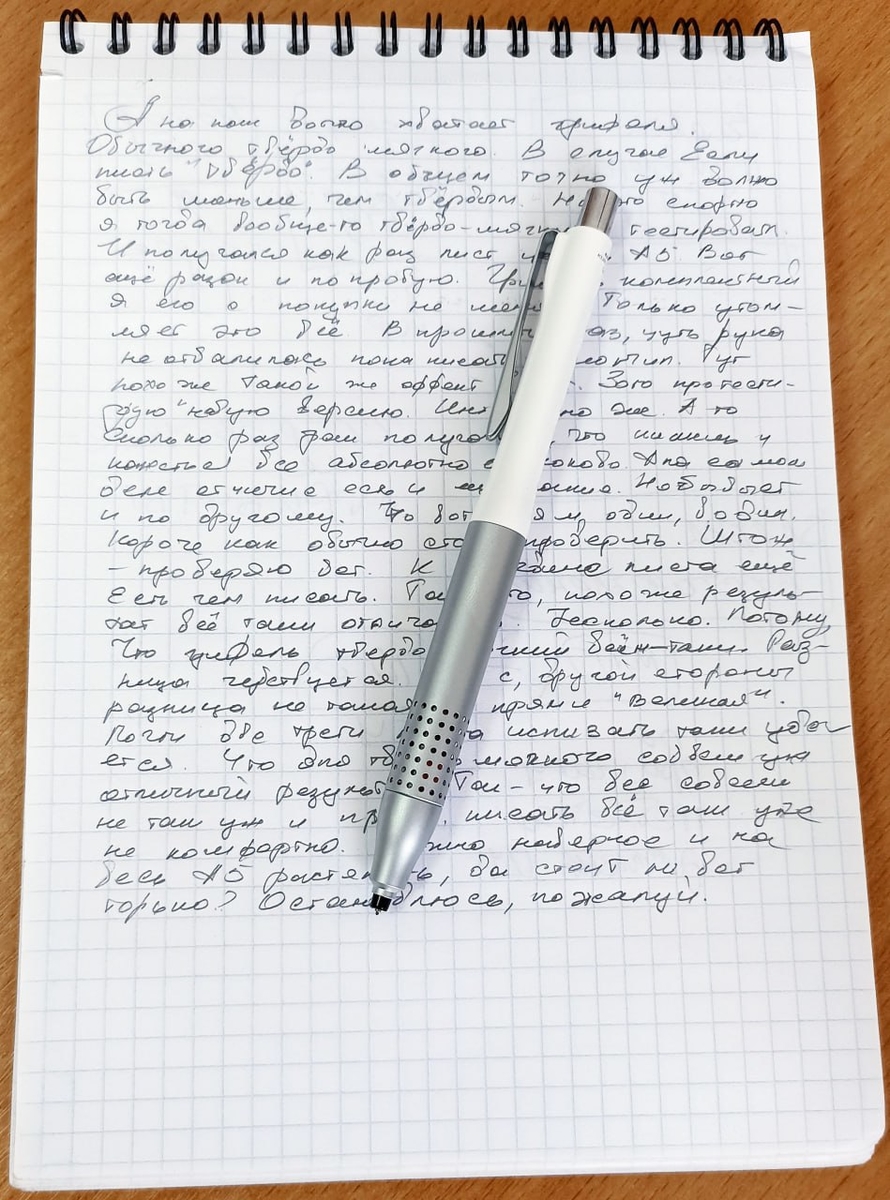 Прежде чем показать письменный тест, скажу, что тонкий грифель благодаря такому механизму действительно практически не ломается. Ключевое слово — практически. Пару раз за неделю нечастого письма всё же случалось… Как будет дальше — посмотрим.