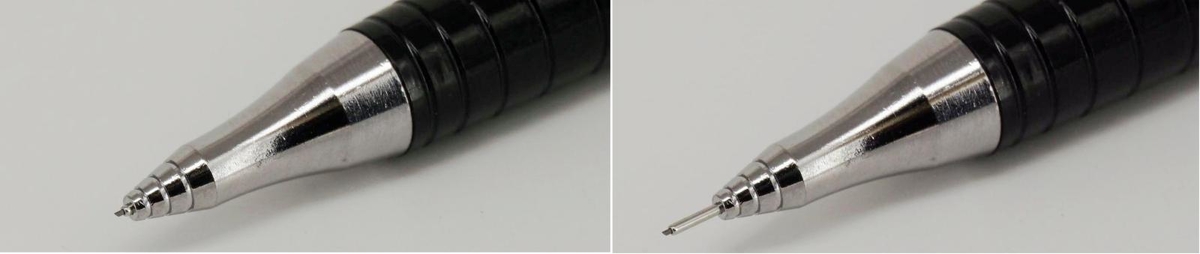 После теста направляющая втянулась почти вся, а далее — под воздействием кнопки — происходит выпуск трубки и грифеля на полную, то есть на 2,5 мм. Эту особенность производитель и именует Click Once («нажмите один раз/однократное нажатие»).