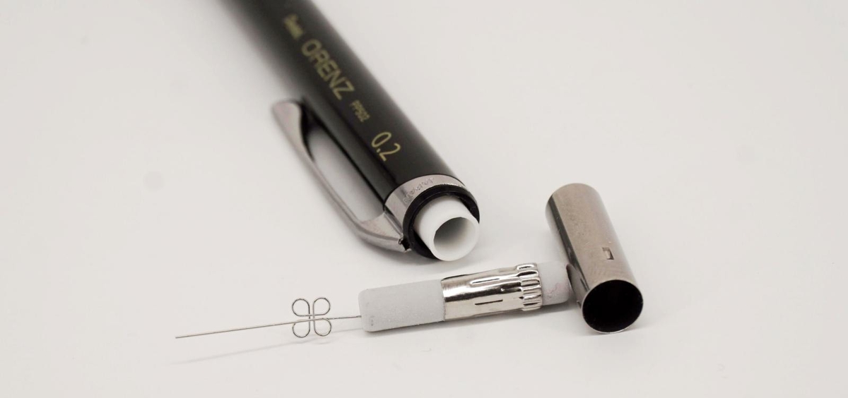 Узнал о линейке Pentel Orenz из комментариев к обзорам в интернете. Стал искать более подробную информацию и нашёл, что главная её особенность — наличие супертонкого грифеля в 0,2 мм: компания выпускает такие специально для этого карандаша, доступны варианты с твёрдостью 2B, В и HB.