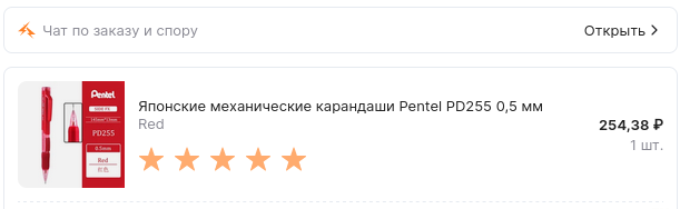 Подумал, что для красных грифелей Pentel красный же карандаш и подойдёт. Заказал его на Aliexpress за 254 рубля с копейками (на тот момент), плюс платная доставка: итого вышло округлённо 305 рублей.