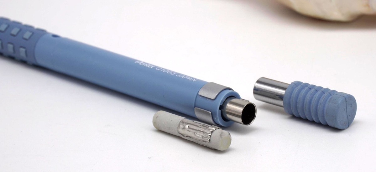 Под ней — ластик, обычный для Pentel (Z2-1N): его диаметр — 4,2 мм, диаметр в металлической оправке — 4,7 мм, но вот длина побольше — 21,5 мм. Стирает отлично, бумагу повреждает минимально. Замена доступна, например, на pentelpen.ru (не реклама).