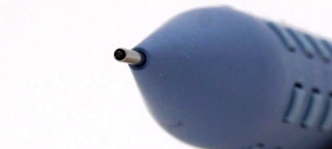 Фиксированная направляющая трубка грифеля сделана из нержавейки, примагничивается слабо. Диаметр — 0,8 мм, длина — 4 мм: карандаш можно использовать для черчения. Края трубочки качественно скруглены и заполированы. Люфт грифеля в направляющей незначительный, но ощущается.