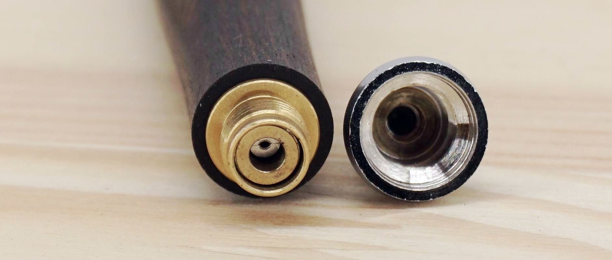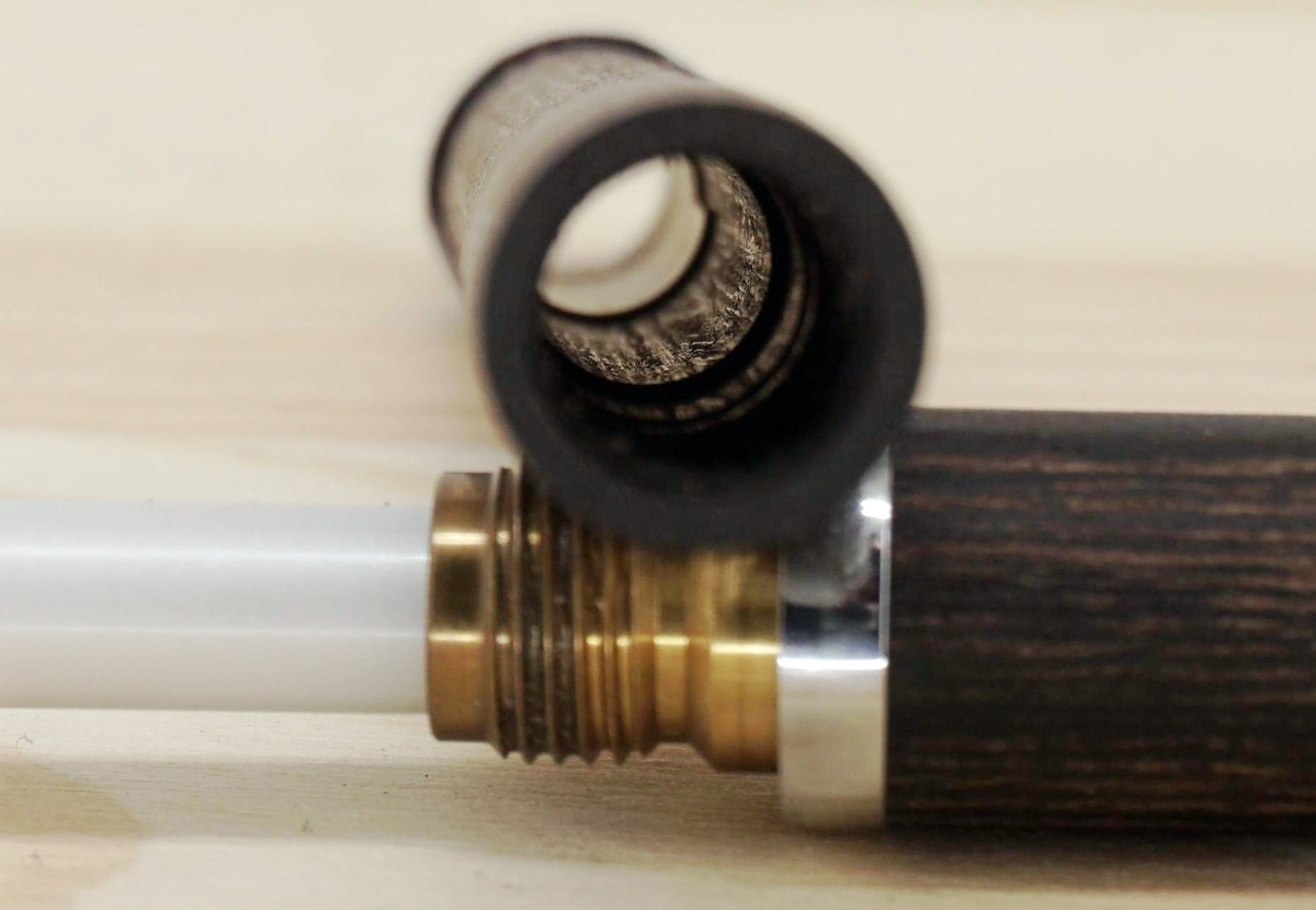 Деревянный корпус — действительно интересное решение. Его верхняя часть откручивается, и можно увидеть, что резьба нарезана прямо в дереве, здорово.