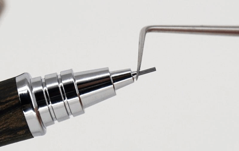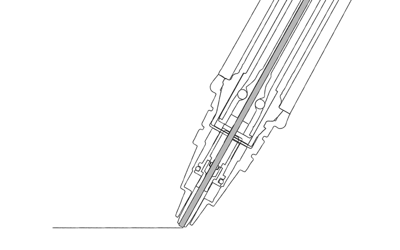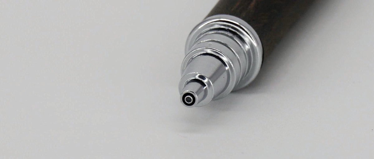 Конус металлический. Направляющая трубка не фиксирована, коническая: на конце диаметр — 1 мм, в выдвинутом положении длина — 2,7 мм. Качество обработки края трубочки отличное, что важно, ведь она постоянно касается бумаги.