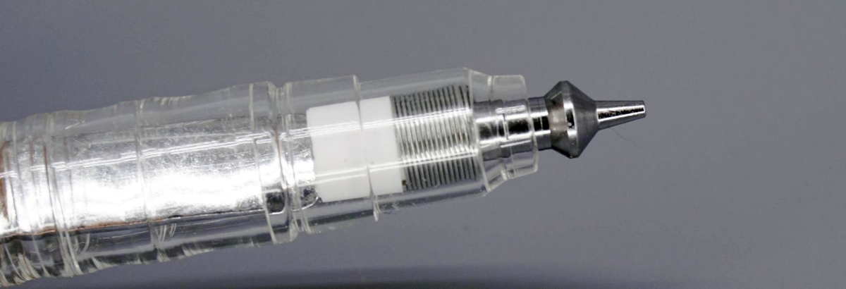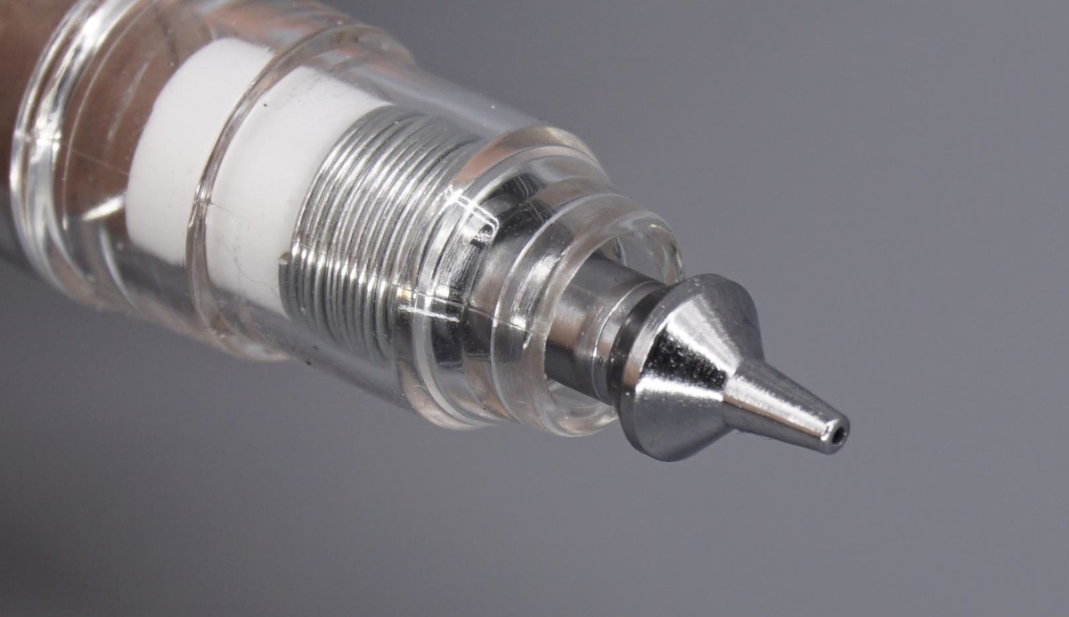 Направляющая трубка у карандаша коническая, стальная, совмещена с плавающим подпружиненным металлическим конусом. Её длина — 3 мм, и это не чертёжный вариант, лучше использовать для письма. Качество обработки края трубочки отличное. Диаметр на конце — 1,1 мм.