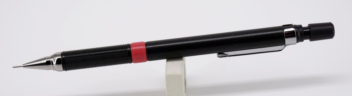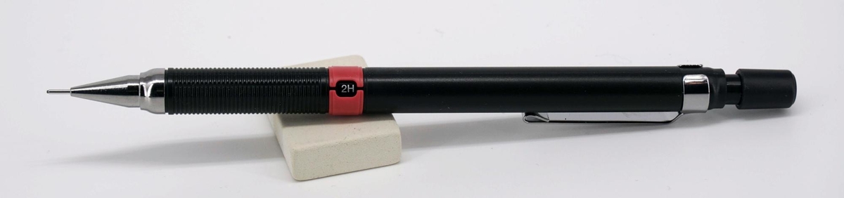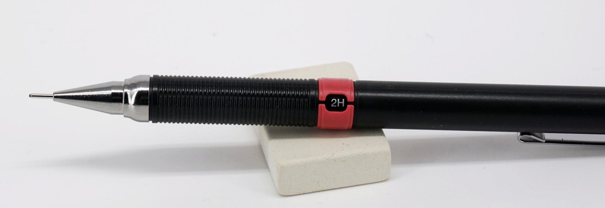 Выше грип-секции красное колечко индикатора твёрдости установленного грифеля. Значение выставляется поворотом этого кольца, фиксируется чётко. Доступны: 2B, B, HB, F, H, 2H, 3H, 4H.