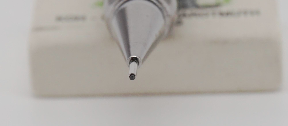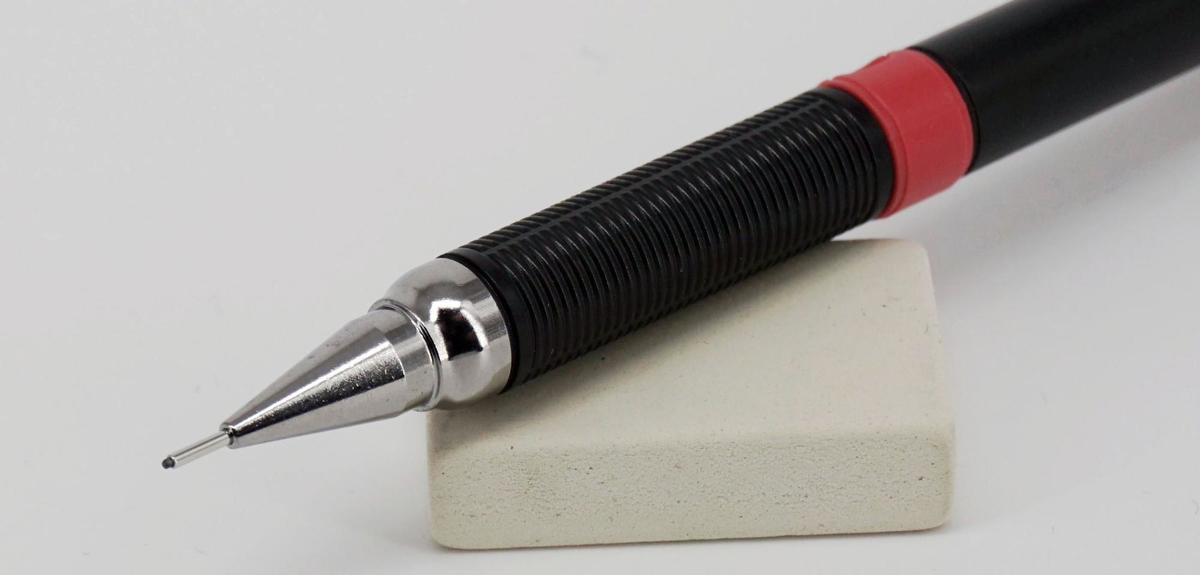 Длинная направляющая трубка удобна для разметки, в работе с линейками, трафаретами, да и при обычном письме всё хорошо. Подача грифеля, на мой взгляд, великовата — по 0,8 мм, но она точная и стабильная; работает не так мягко, как у тех же Pentel, но тоже ничего.
