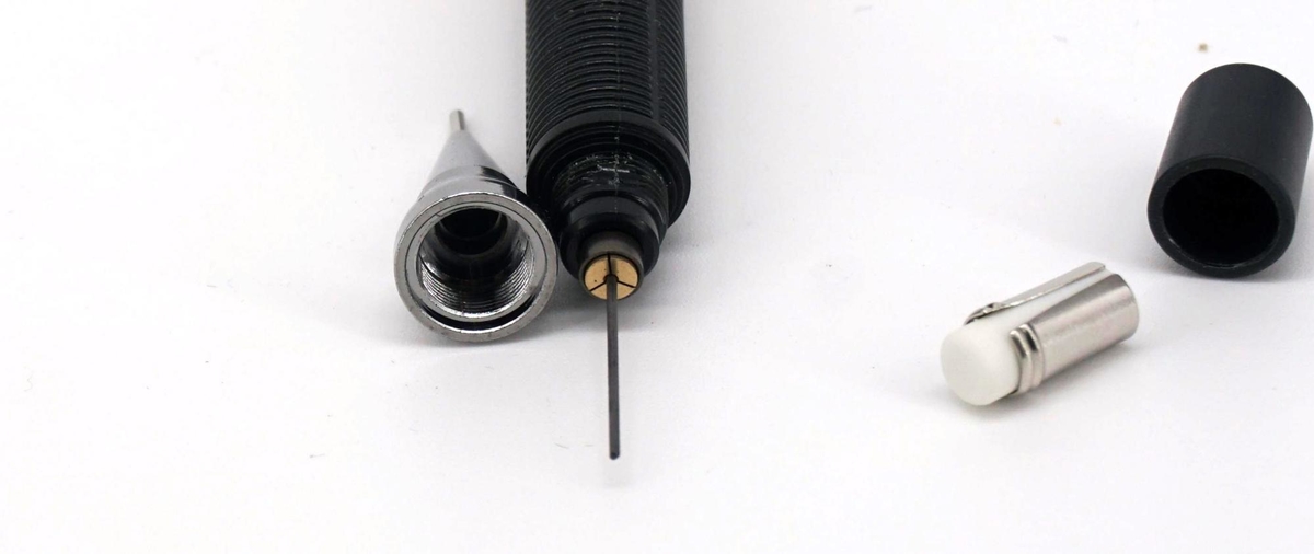 Под кнопкой ластик в металлической обойме, а под ним — шахта для заправки грифелей.
