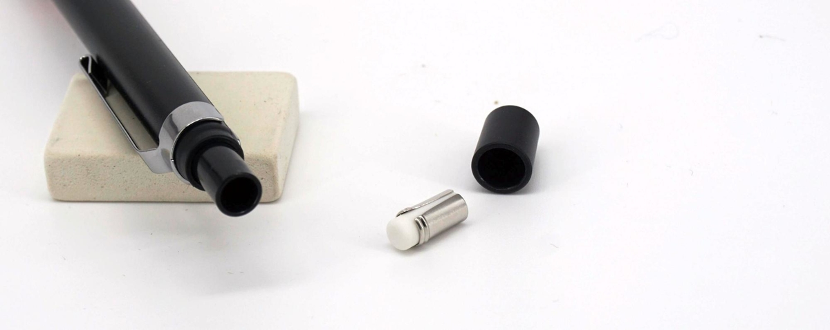 Ластик короткий — 10,5 мм, его диаметр — около 4,1 мм, диаметр обоймы — примерно 4,6 мм. Сменные можно найти в продаже: подойдут Zebra A.
