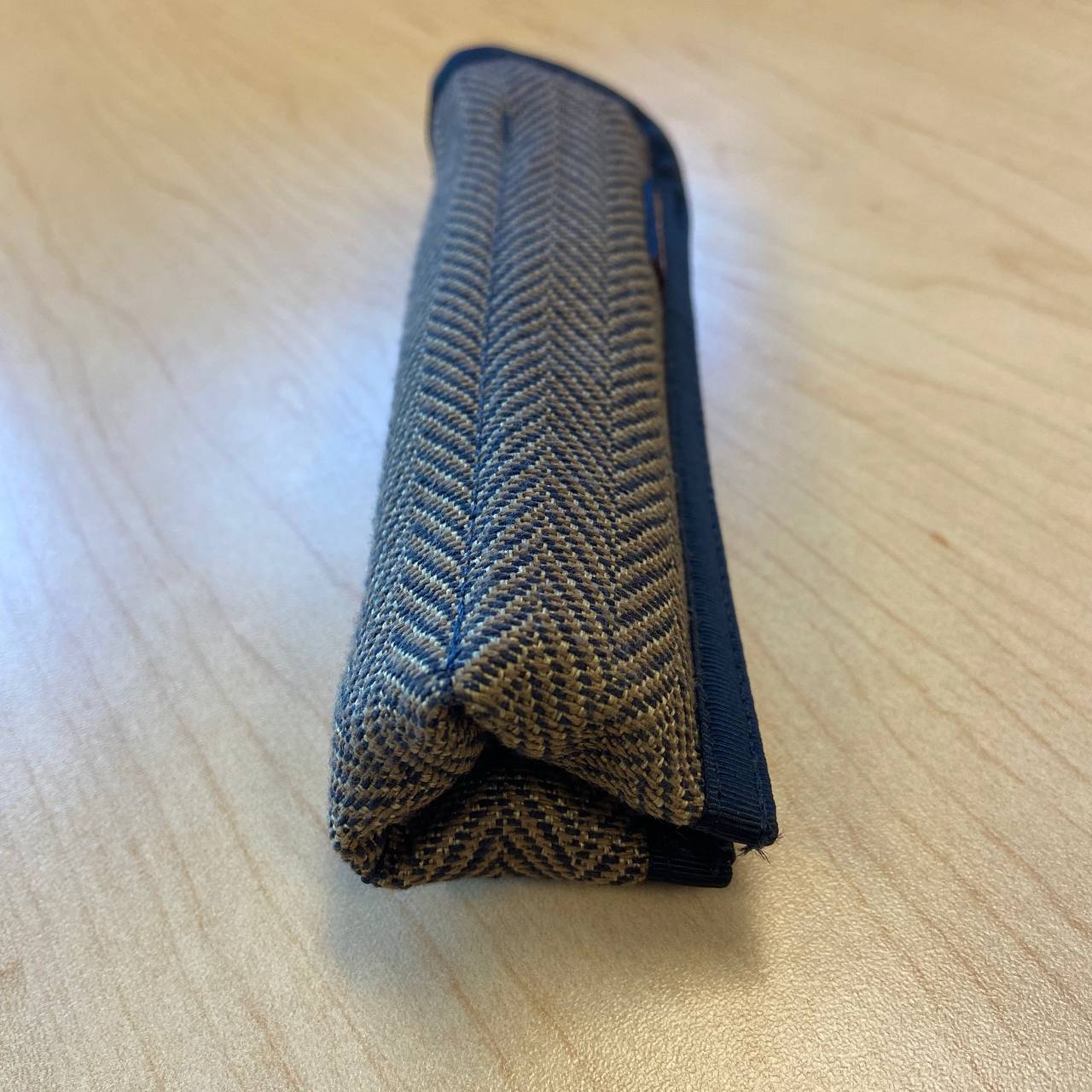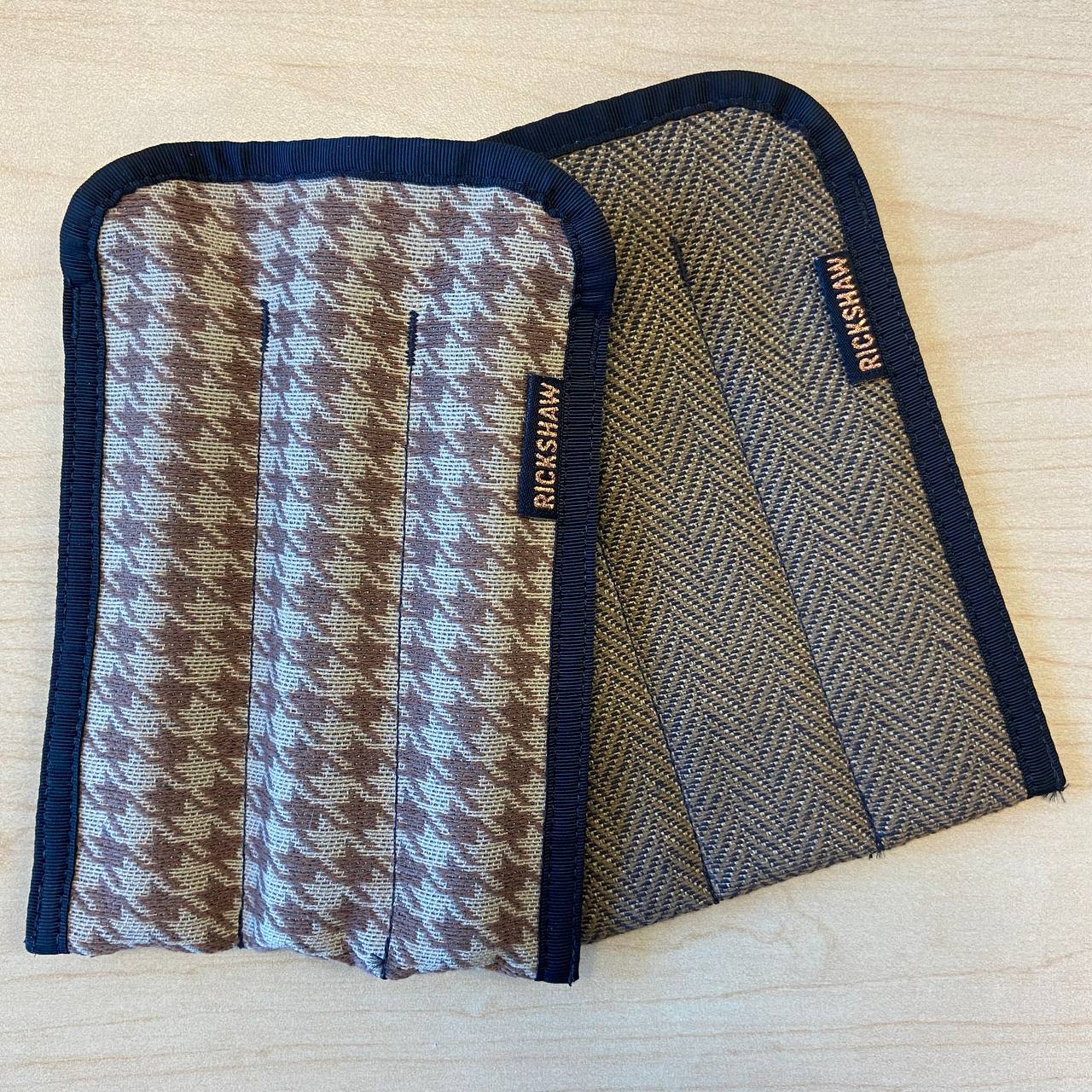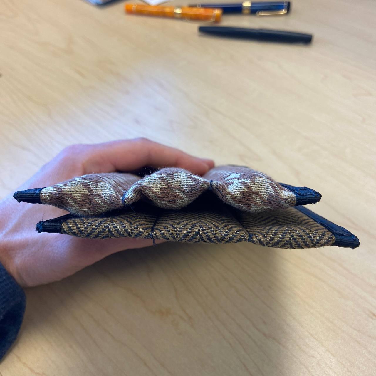 Перейдём к моей парочке пеналов. Я выбрал их в нейтральных бежево-коричневых расцветках с принтом «гусиная лапка» и контрастной обшивкой-окантовкой. На лицевой стороне справа присутствует лейбл производителя. Рассчитаны оба на три ручки.
