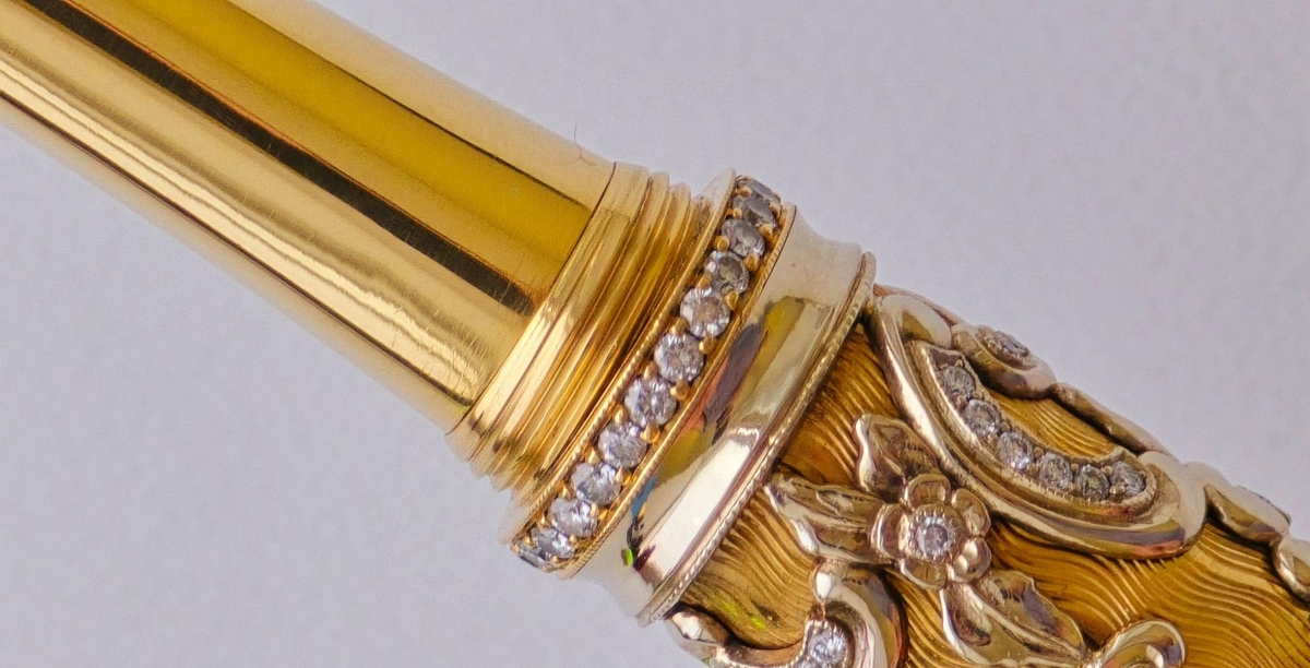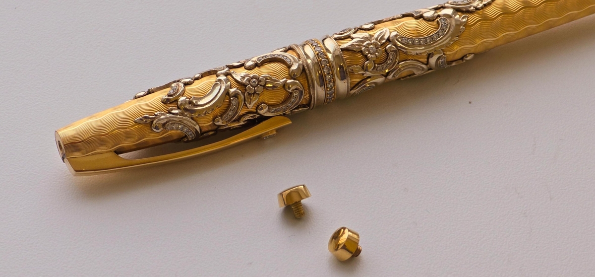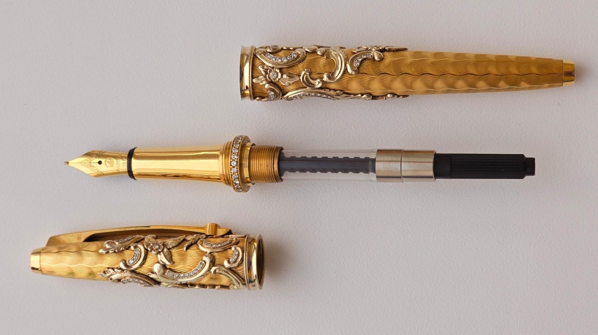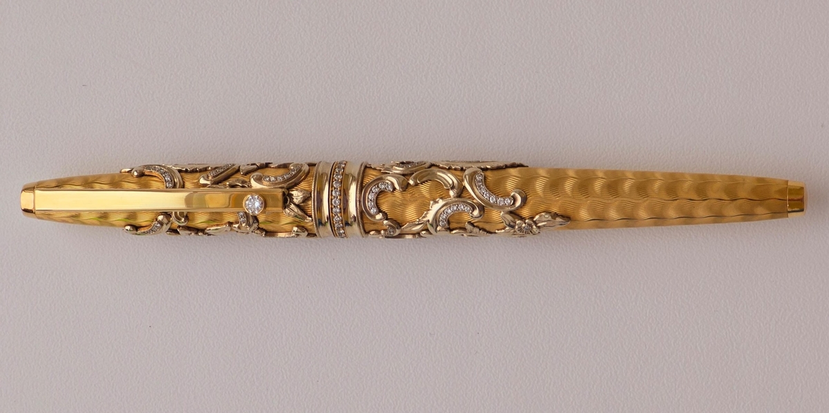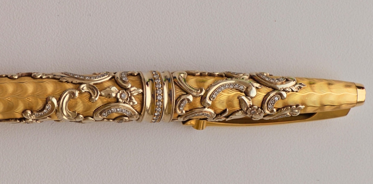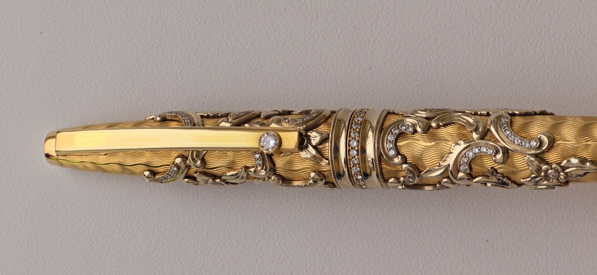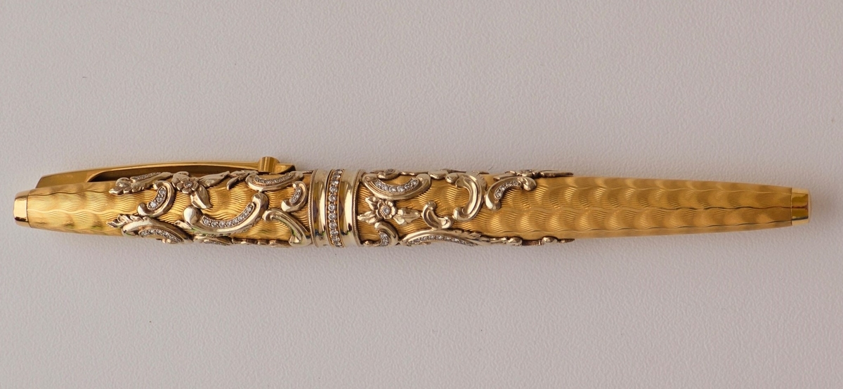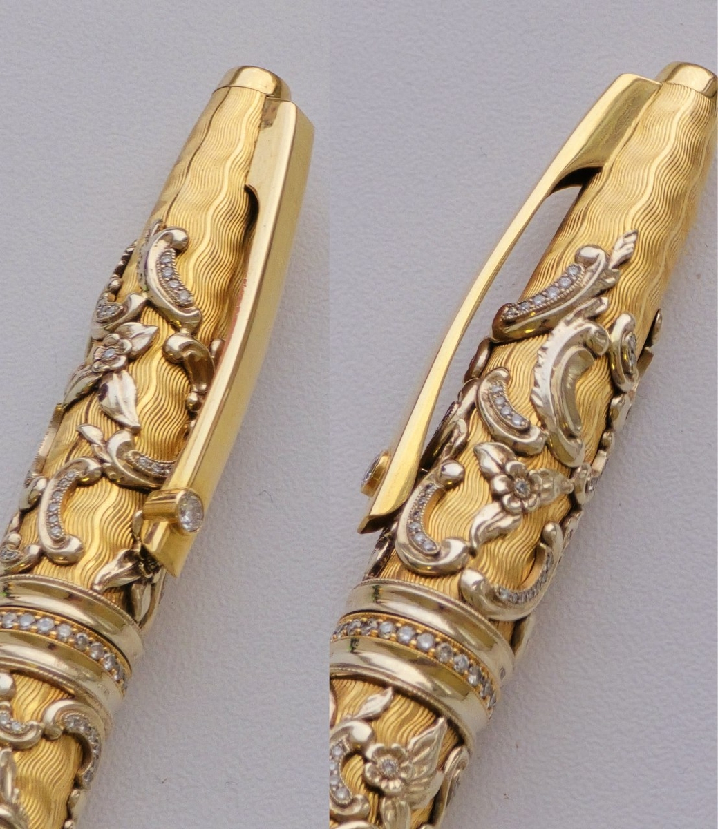 О материалах и говорить не приходится: корпус и колпачок выполнены из золота 750-й пробы, украшены 161 бриллиантом.